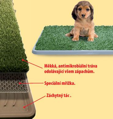 Když si pořídíte domů roztomilé štěně větší rasy, bude dlouho trvat, než ho naučíte, že vyměšovat se má venku. S tím vám však zásadně může pomoci psí toaleta. Naše toaleta, má na rozdíl od ostatních toalet na trhu, jako první kontaktní vrstvu měkkou antimikrobiální trávu odolnou zápachu, pod ní je speciální mřížka, která propustí moč až do spodního dílu toalety do záchytného tácu.