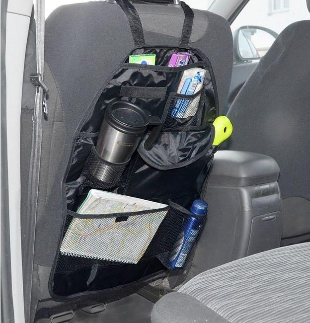 Tahle šikovná věcička je moc prima, hlavně když vozíte vzadu v autě děti, které pořád něco chtějí. Samozřejmě kouzlo tohoto kapsáře objeví i ti, kteří sice děti v autě nevozí, ale zato mají rádi v autě pořádek a vše na svém místě. Jednoduše připevněte tento kapsář na zadní stranu předního sedadla, upevněte horní část pomocí popruhů za opěrku hlavy a spodní části popruhů za sedadlo. Získáte tak kapsář se síťovanou kapsou na mapy, velkou kapsu uzavíratelnou na suchý zip, další síťovanou kapsu na drobnosti, přihrádku na časopisy, držák na tužky a kapsu na láhev s nápojem. Už nikdy se nebudete muset při jízdě otáčet, aby jste něco dětem podali, budou mít vše na dosah ruky přímo před očima. Navíc vám svýma botami neokopou a neponičí sedačku před sebou. Věci se nebudou v autě povalovat a vy budete mít uklizené a čisté auto.