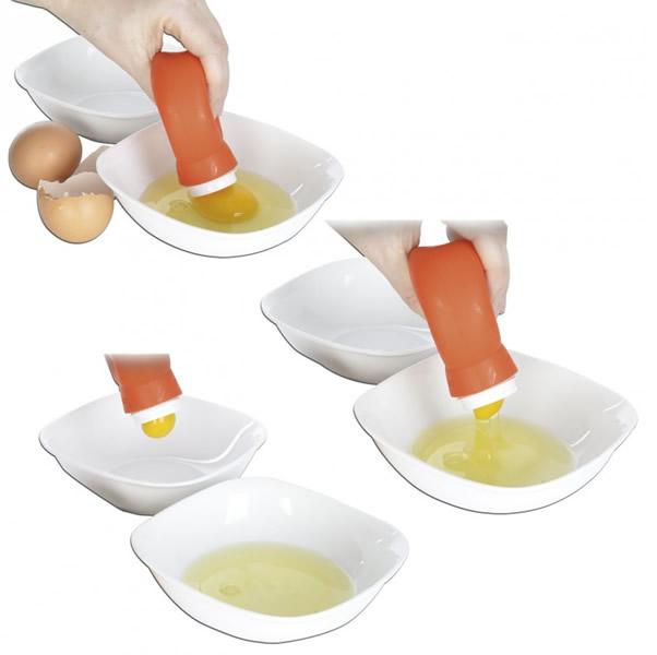 Vajíčko vyklepnete celé do misky a pomocí oddělovače vcucnete žloutek do pouzdra a to vyprázdníte pomocí stlačení do jiné nádoby.