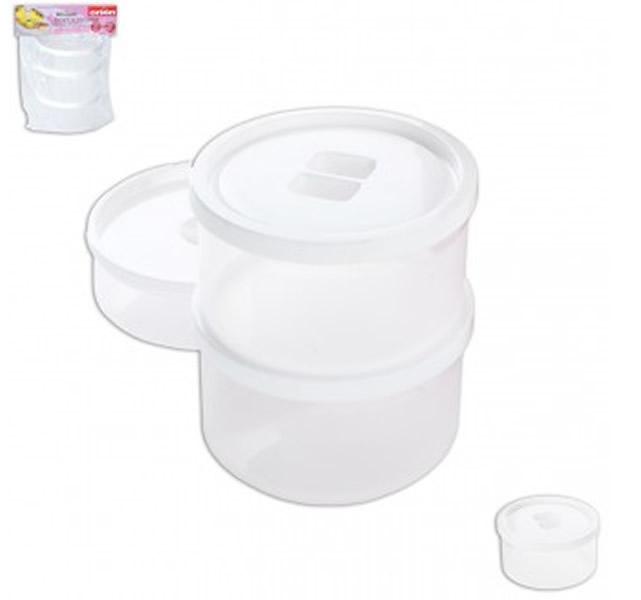 Rozměry: 2x dóza s víčkem 0,3 l, pr. 10 cm, v. 5,5 cm, 1x dóza s víčkem 0,25 l, pr. 10 cm, v. 3,5 cm.