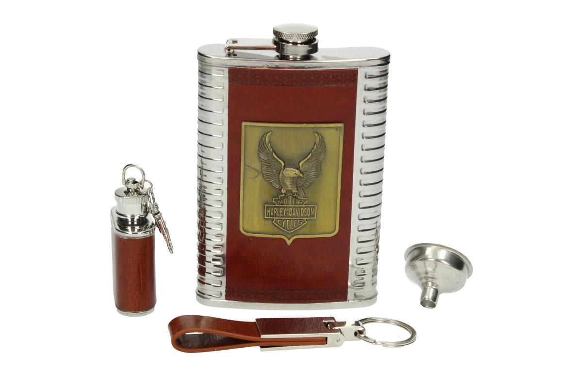 - Sada pro milovníky jedné stopy, obsauhje vetší nerezovou Stainless steel 9 Oz placatici se znakem a nápisem Motor Harley Davidson Cycles + ještě jednu maličkou placatku 1 Oz a k tomu nalévací trychtýřek a ještě přívěskový závěs.