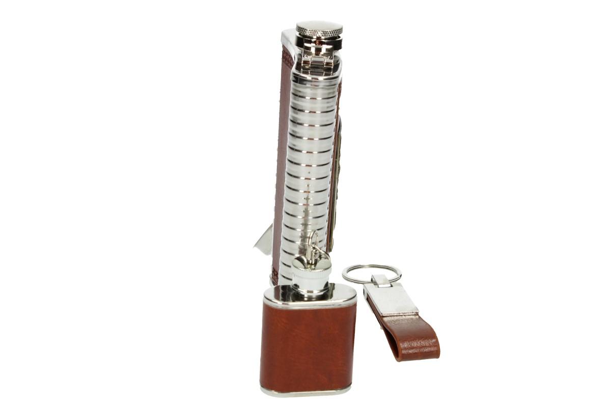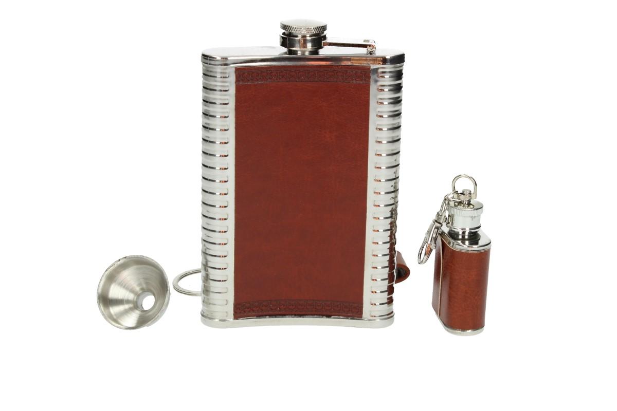 Nerezová placatka o objemu 850 ml s panáky a zavíracím nožem 5v1 v robusním kože…