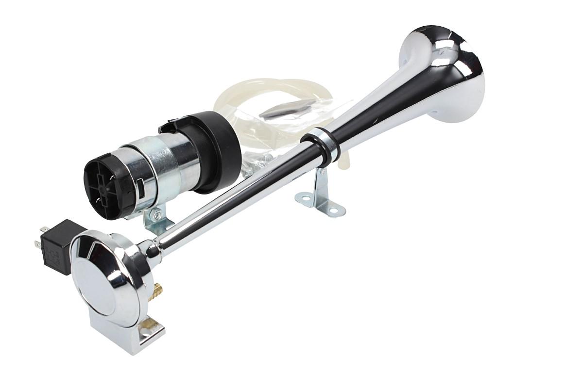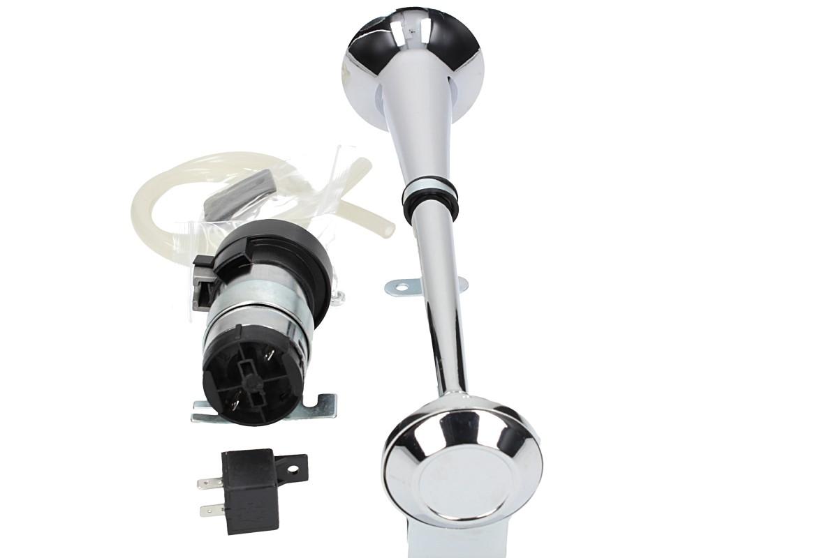 Elektrický klakson s kompresorem elektrický 12V vzduchový je velmi výkonný klakson v chromované úpravě vhodný do automobilu, nákladního vozu nebo na motocykl. Elektrický klakson s kompresorem vzduchový je vybaven spínacím relé, průhlednou vzduchovou hadicí, šrouby k přichycení a velkou troubou o délce 37 cm. Tento klakson vydává opravdu mohutný zvuk, díky kterému si Vás každý všimne.