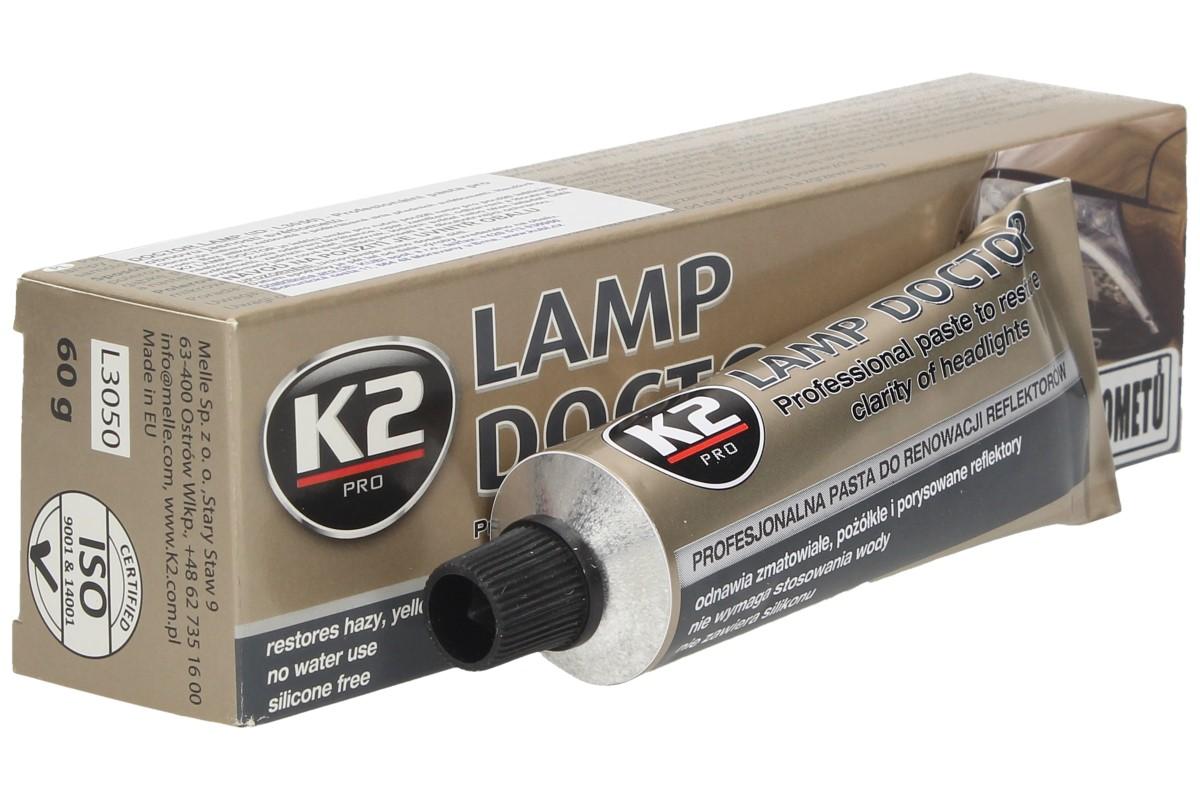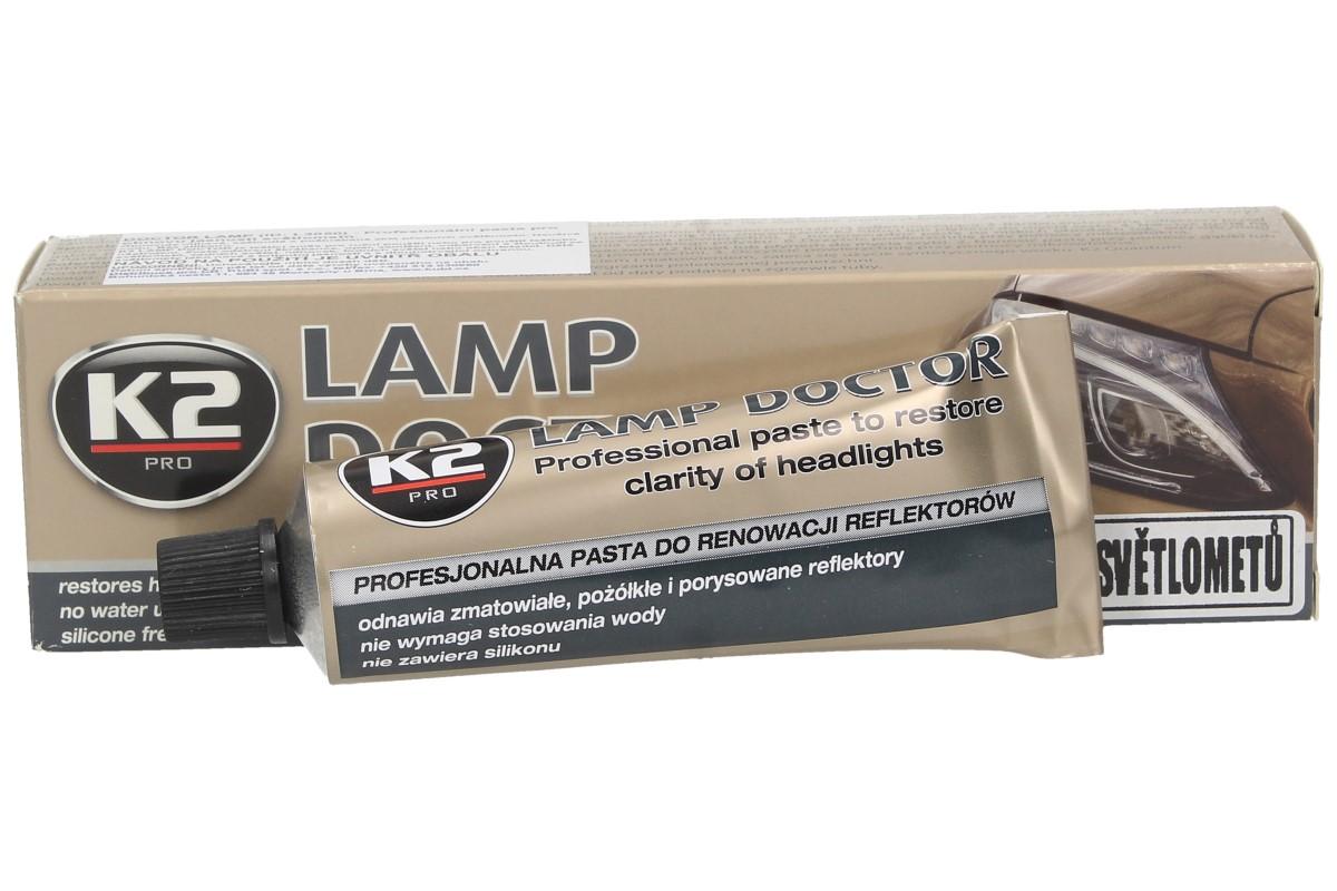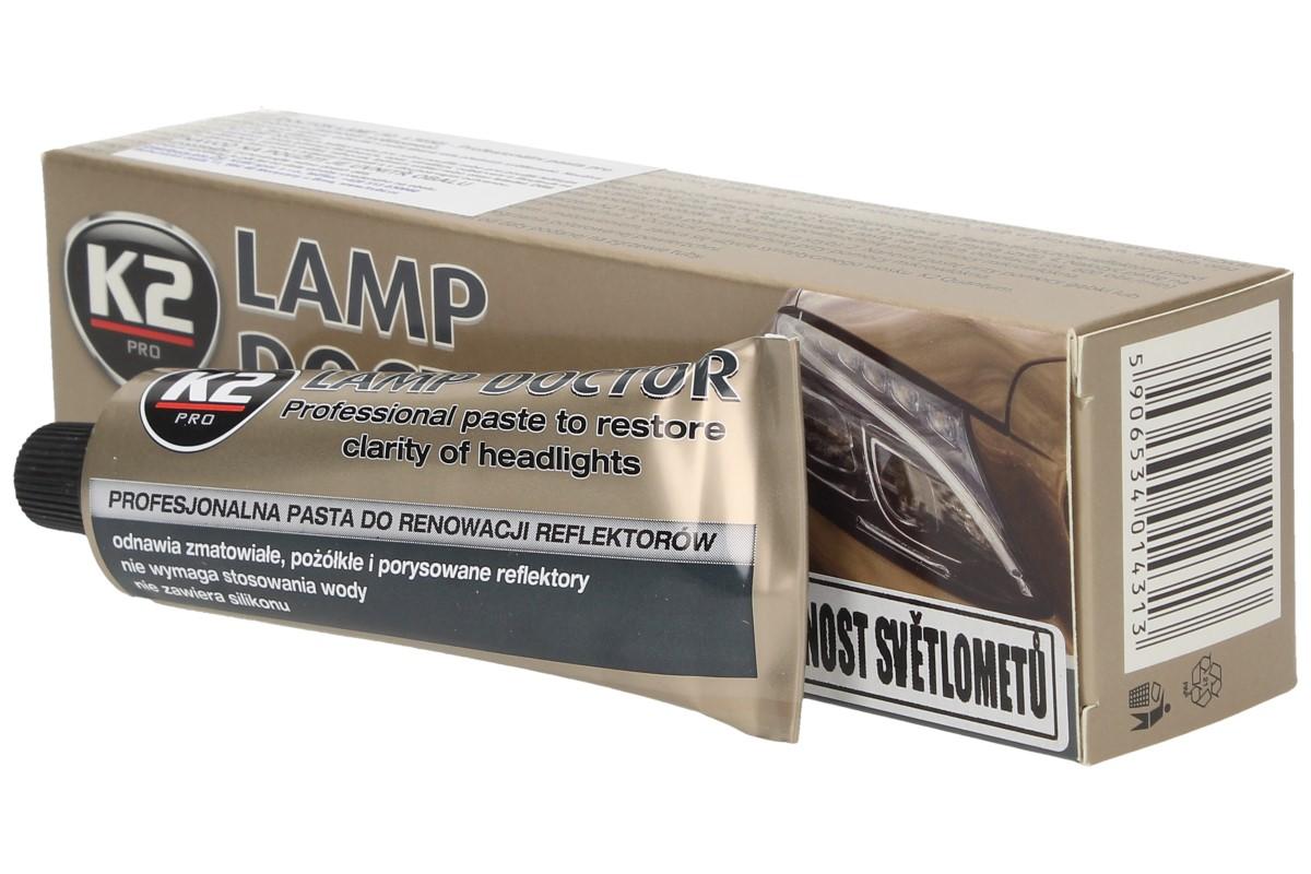 Leštící stroj: 1. Chraňte všechny lakované povrchy kolem světlometů malířskou páskou, aby se zabránilo poškození. 2. Velké defekty na těžce opotřebovaných světlometech mohou být zdrsněny pomocí smirkového papíru. 3. Před použitím vyčistěte a odmastěte povrch, který má být ošetřen (pomocí K2 KLINET nebo čističe pro čelní sklo). 4. Naneste malé množství leštidla na pěnovou podložku (např. K2 DURAFLEX) před zapnutím vrtačky. 5. Rozetřete pastu vrtačkou při 600 otáčkách za minutu, poté zvyšte otáčky až na cca. 1200 otáček za minutu a leštěte tak dlouho, dokud nezmizí zakalený opar. 6. Použijte čistou mikro úterku a vytřete do sucha.