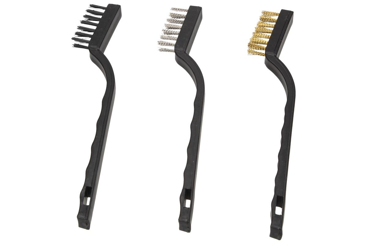 Ocelový ruční kartáček s plastovou rukojetí měří celkem 17 cm, samotné štětiny pak 1,5 cm. V sadě najdete tři kartáče s rozdílnou tvrdostí štětin. Stříbrný nerezový, zlatý mosazný a černý umělý kartáček, všechny je využijete k citlivějšímu vyčištění především menších a těžce dostupných ploch. Budete tak mít víc pod kontrolou úbytek materiálu z čištěného předmětu a také mnohem méně naprášíte.
