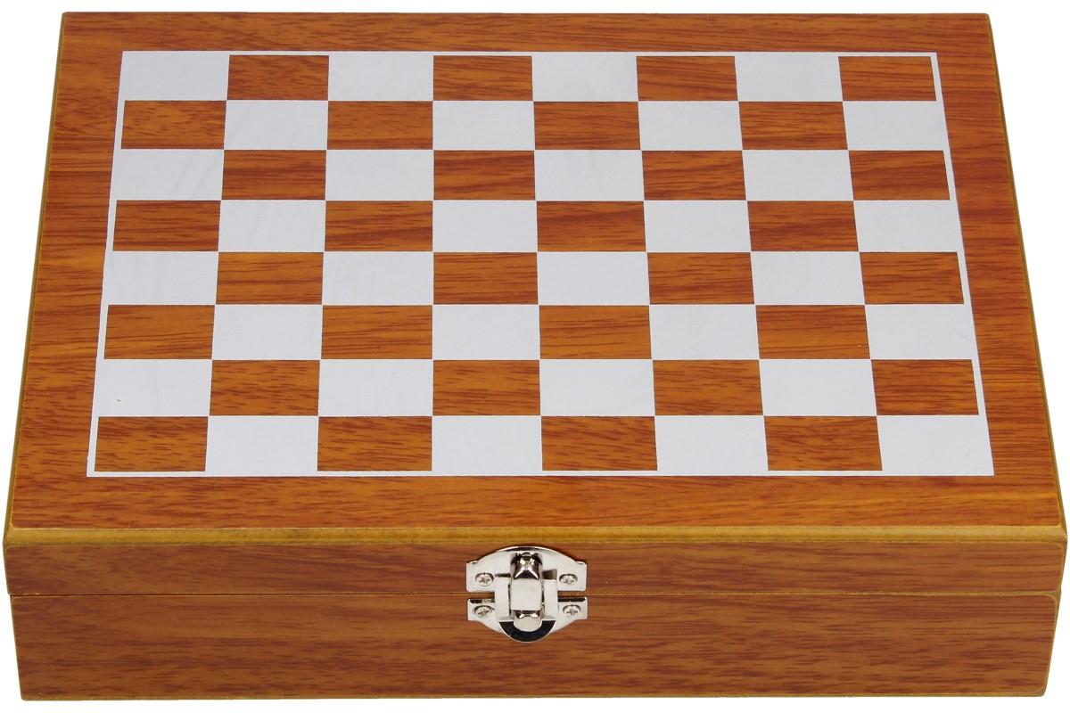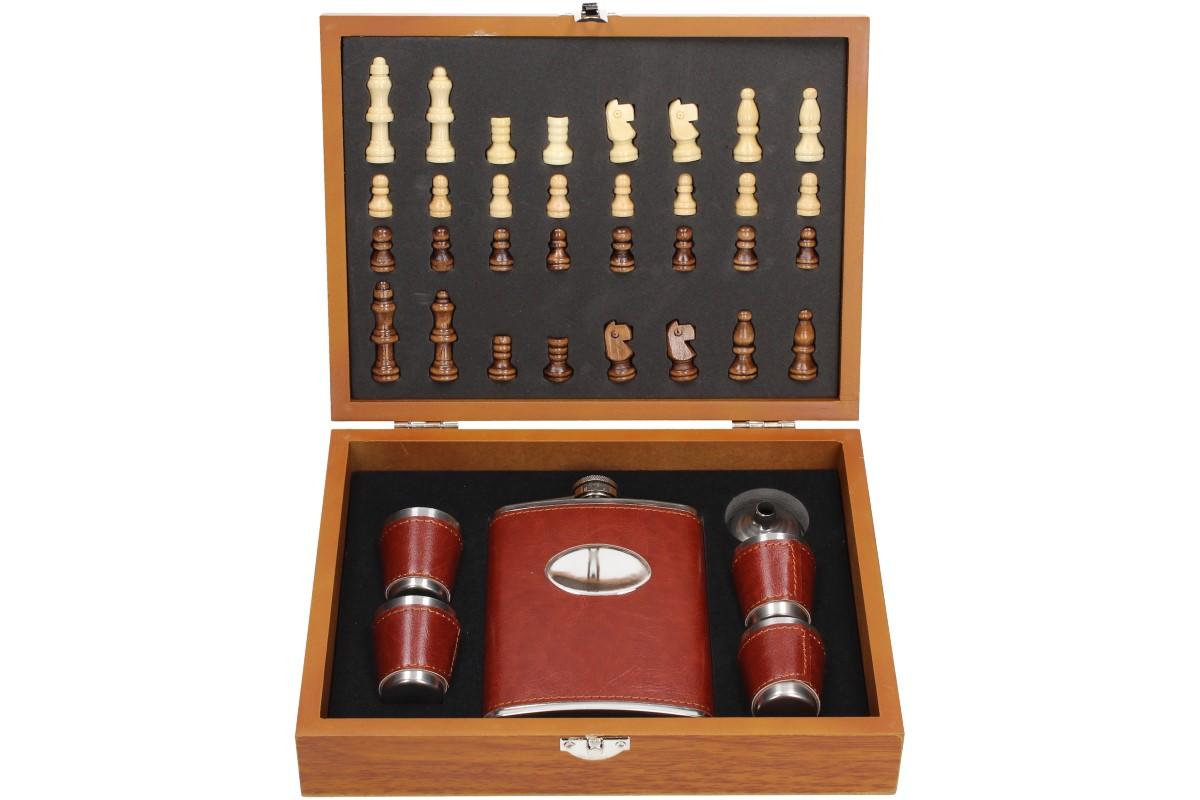 Originální dárek v podobě dřevěné kazety s namalovanou šachovnicí na horní venkovní straně kazety. Na spodní straně jsou čtyři protiskluzová kolečka, zamezující nechtěnému posunu a pohybu šachovnice při hře. Uvnitř naleznete kompletní set šachovnicových dřevěných figurek. Placatka o objemu 200ml je vyrobená z kvalitní nerezové oceli Stainess steel, stejně jako nálevka a čtyři kalíšky. Placatka i kalíšky jsou navíc potaženy koženkou, kerá věrně imituje pravou kůži. Tuto krásnou dřevěnou krabičku můžete mít klidně na pracovním stole a nikdo nepozná, že skrývá i alkohol. Ideální jako dárek, nebo na dlouhé cesty vlakem, či jen tak do šachového kroužku :-).