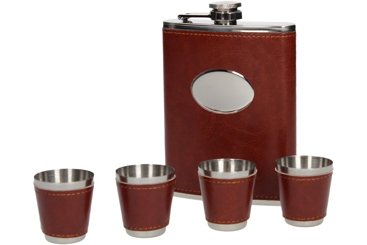 - Materiál: krabička a figurky dřevo, placatka, nálevka a kalíšky nerezová ocel, placatka a kalíšky potaženy koženkou
