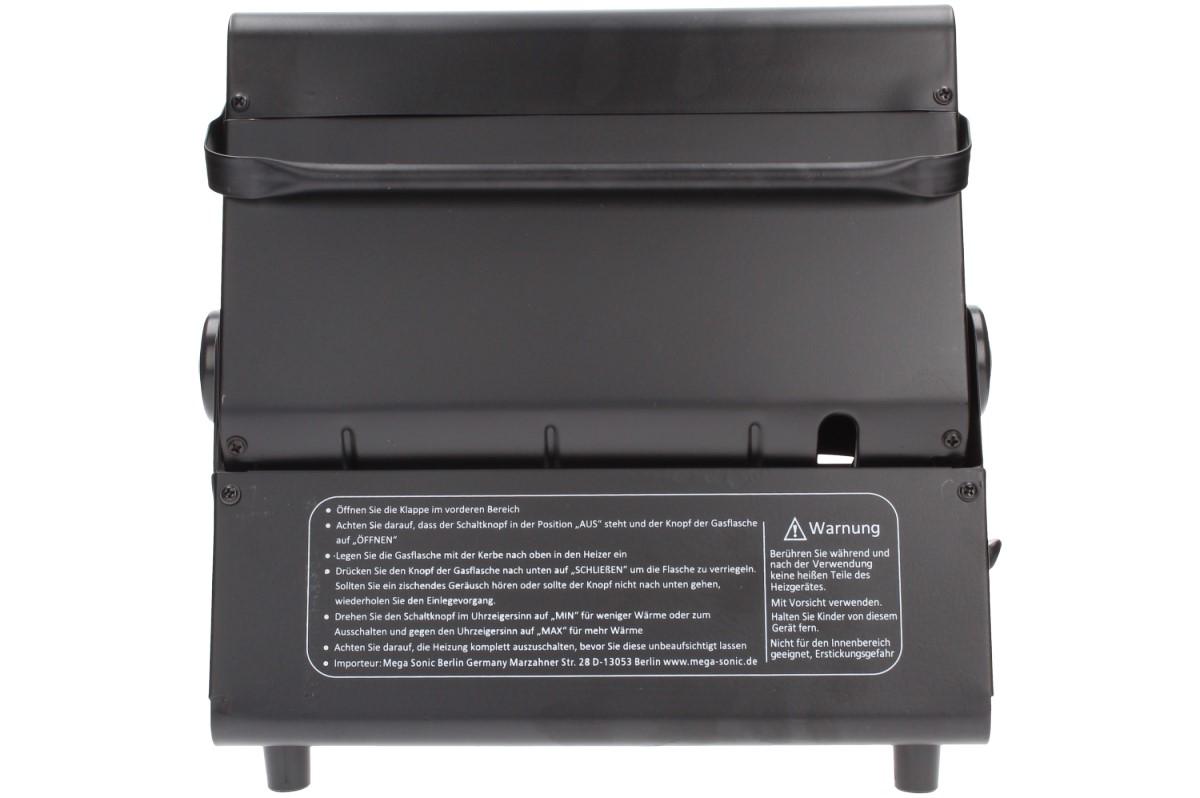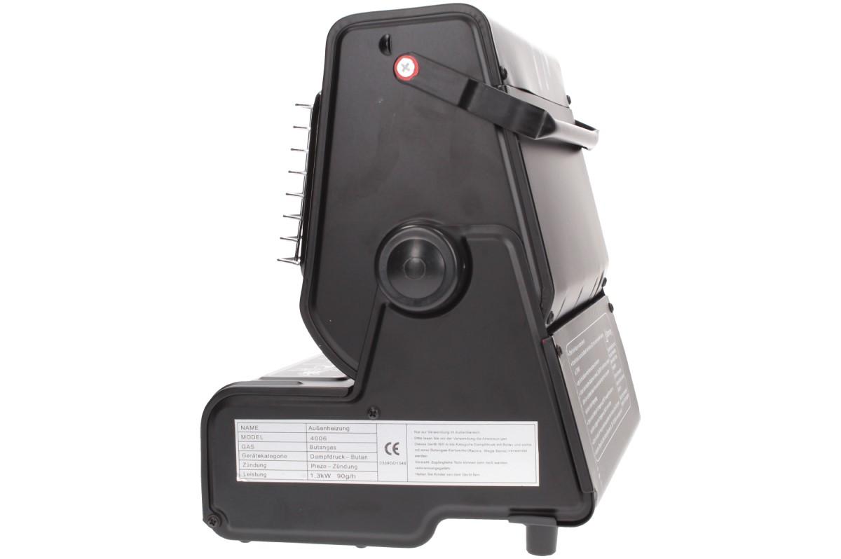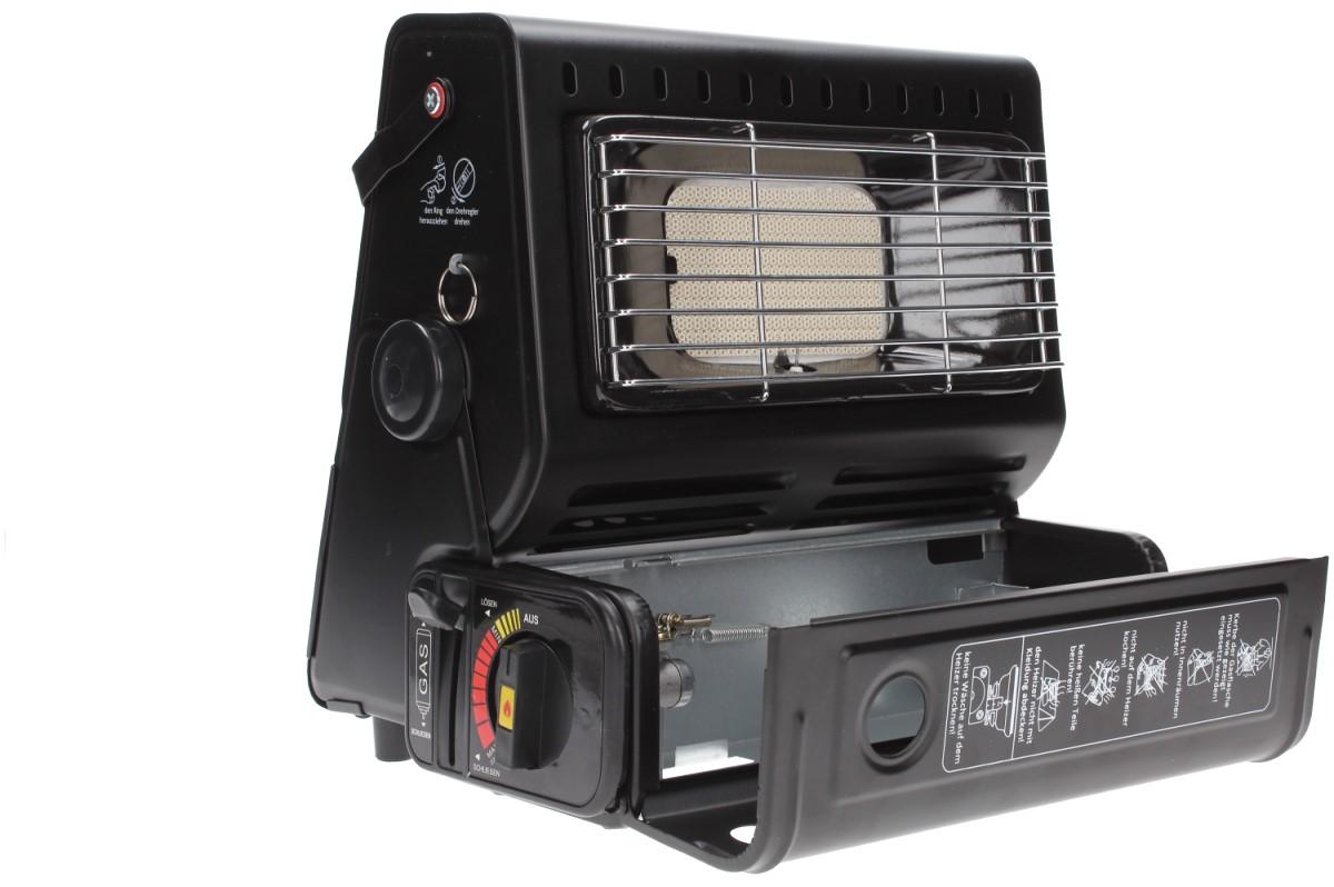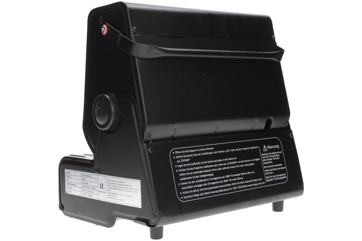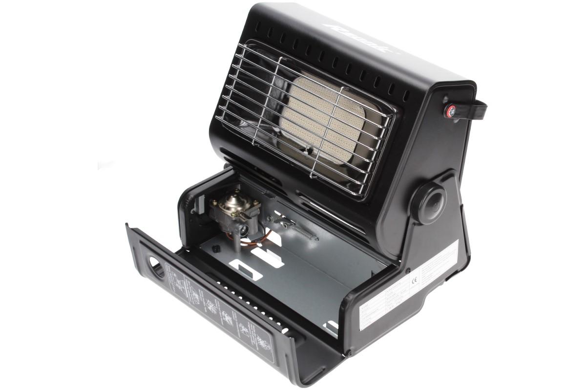 Přístroj má pohyblivé tělo k nasměrování vyhřívání, zapalovací spínač k zažehnutí, klip v místech připojení plynové kartuše, otočné kolečko pro nastavitelnost intenzity tepla a keramický hořák s výkonem 1,3kW, krytý bezpečnostní mřížkou.