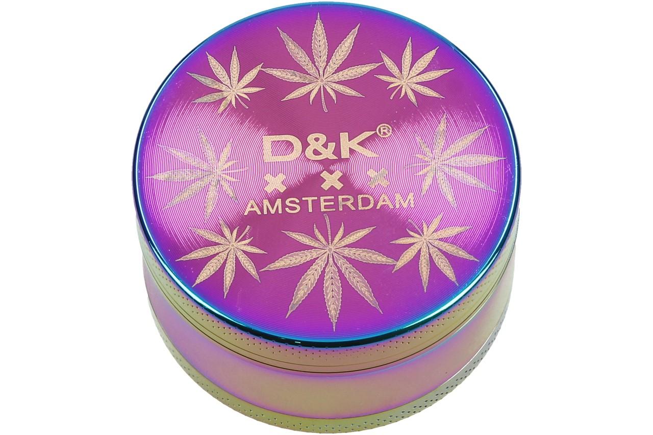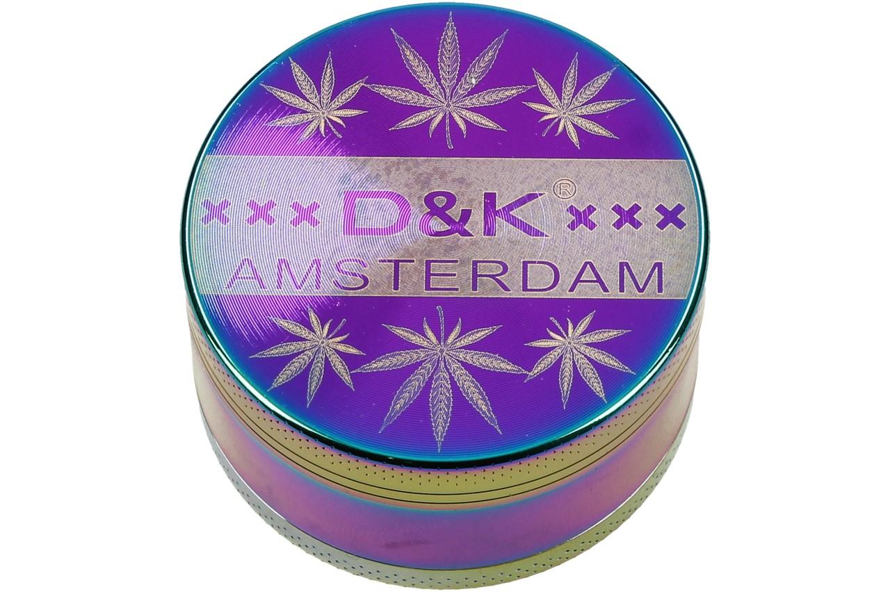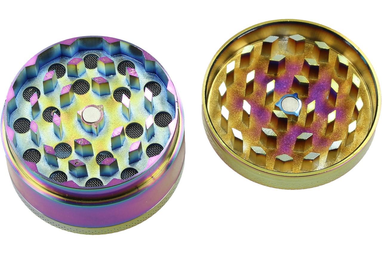 Čtyřdílná hliníková drtička na bylinky a tabák v duhově petrolejové barvě. Samozřejmostí je magnet který drží vrchní díl. Součástí balení je malá lopatička na drobné části. Zuby drtičky jsou broušeny diamantem, bylina je tak rovnoměrně a přesně drcena, větší části zůstavají na sítku, sítkem do nejspodnější části spadá prach z bylin, který je neméně účinný. Drtička má krásné zdobení na vrchní části.