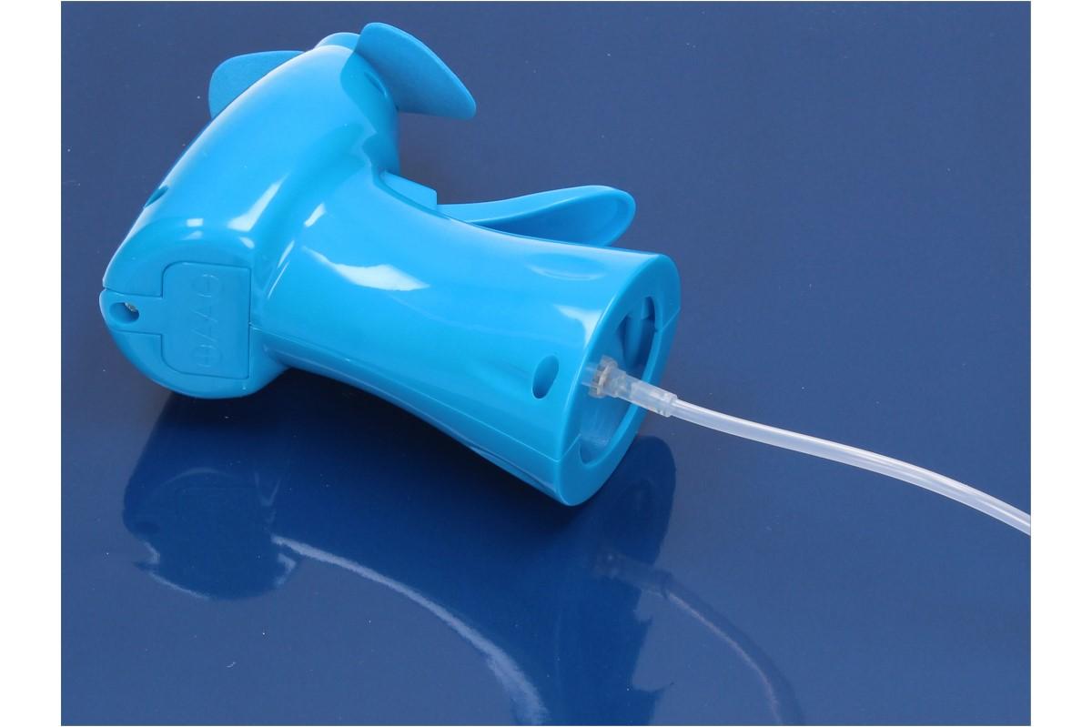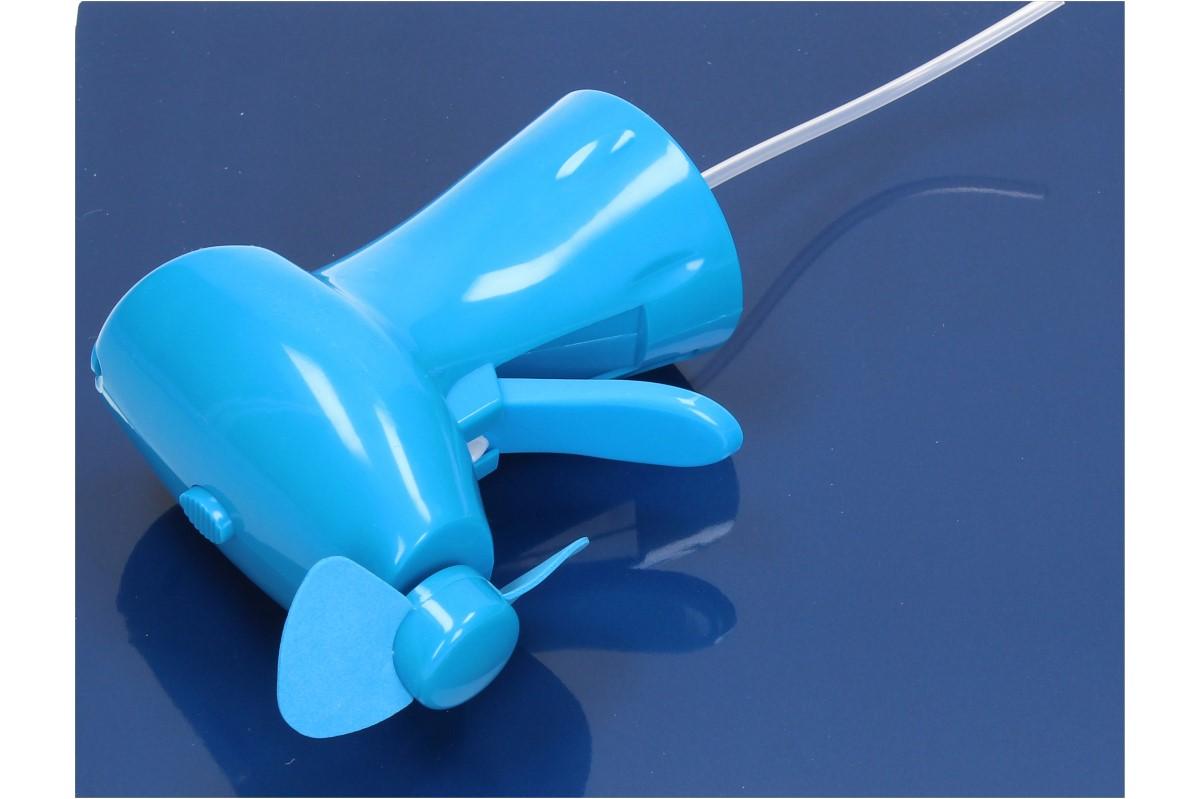Do průhledné nádržky se nalije voda, která je po stlačení páčky jemně rozprašována do okolí. Po stisknutí tlačítka na vrchní straně, roztočí větráček, z měkkého materiálu, stojící vzduch a přinese toužebný vánek. Větráček je poháněn na dvě tuškové baterie AA, které nejsou součástí balení.