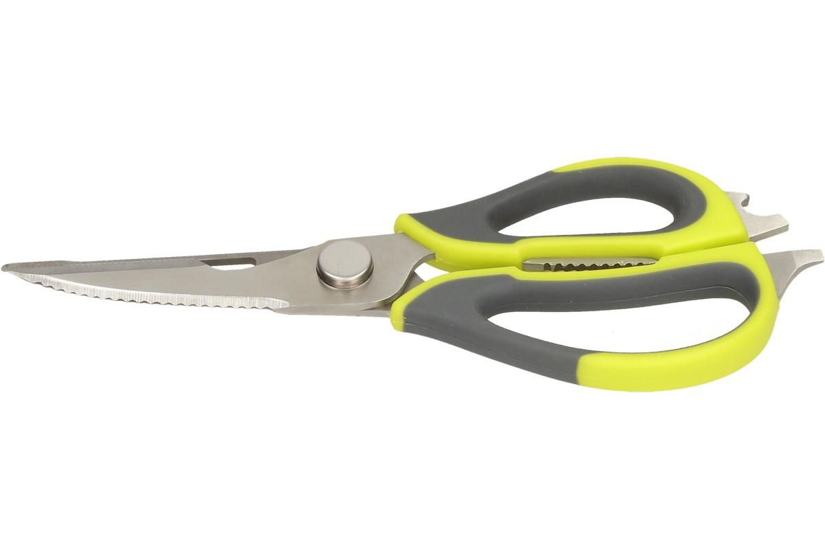 Nůžky víceúčelové poslouží v domácnosti, v kuchyni,... Mají mnoho funkcí - klasické nůžky, otvírák na korunkové uzávěry uzávěry, louskáček ořechů, po rozložení nůž se zubatým ostřím - pilka, nebo otvírač kartónů, šroubovák, nůžky na kuře, škrabka na zeleninu.