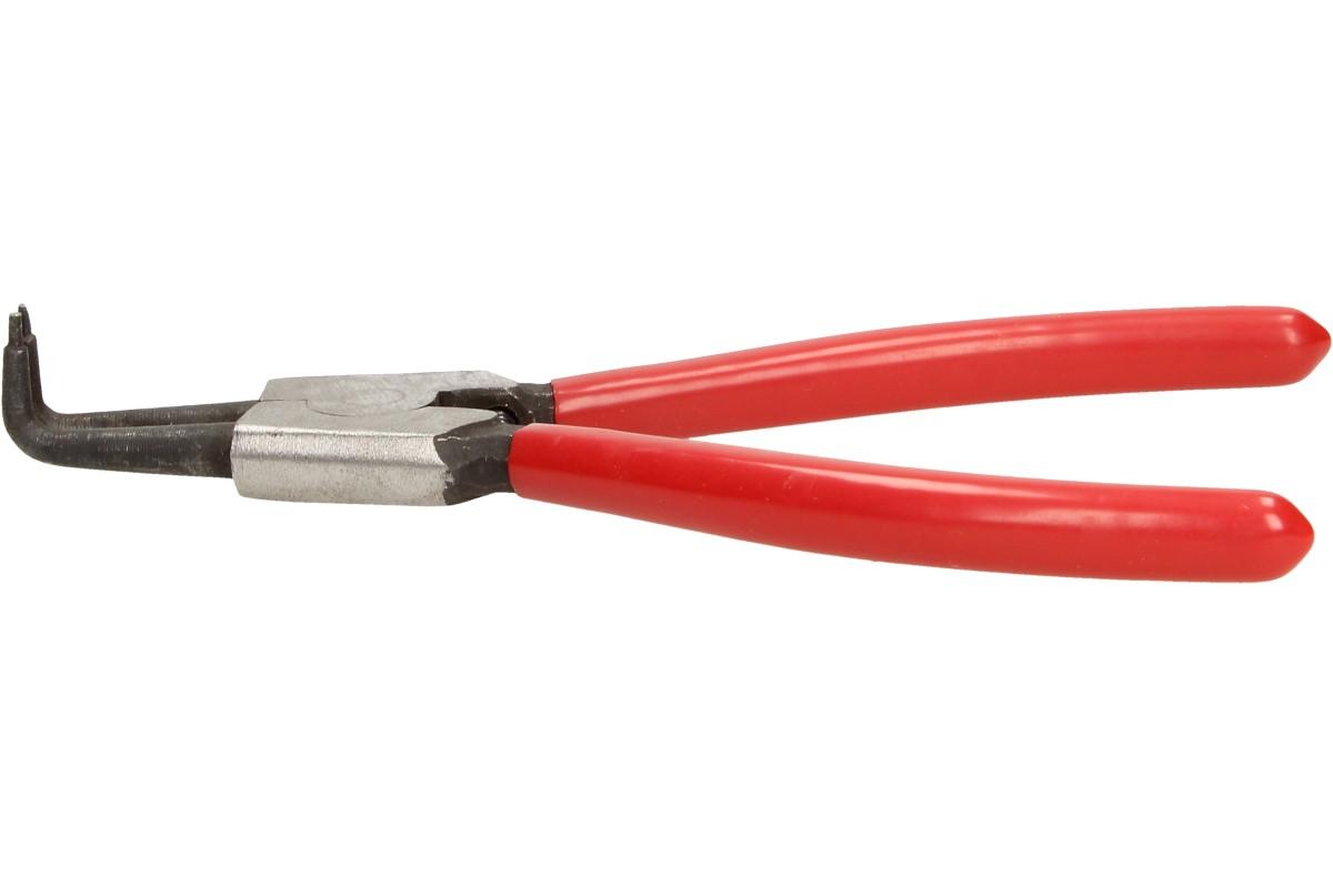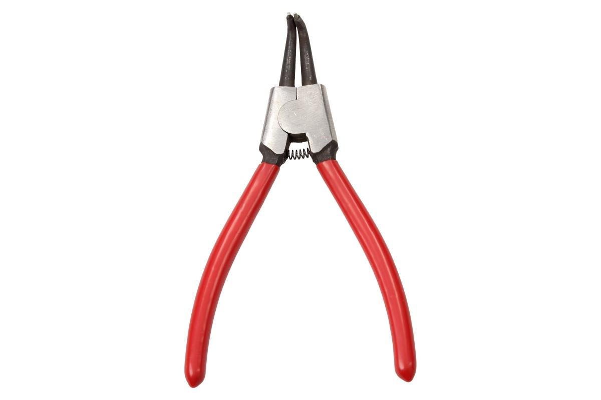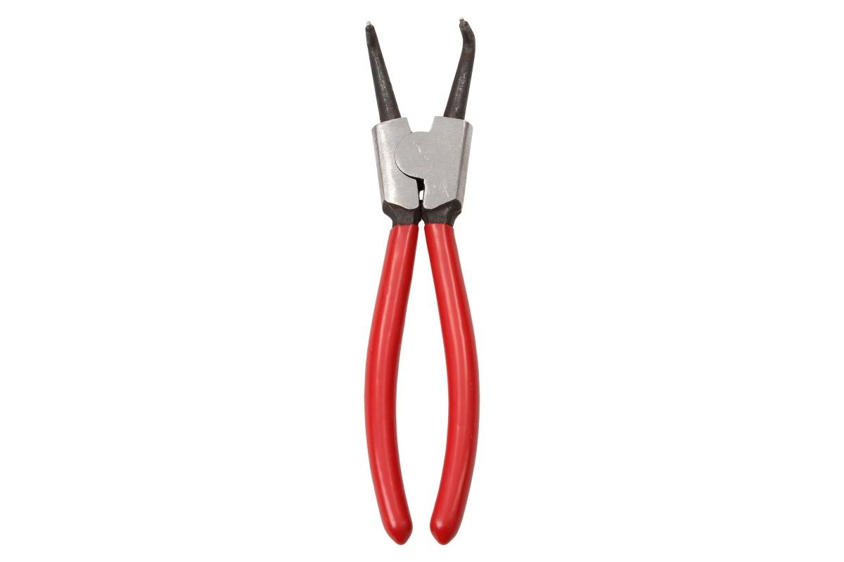 Roztahovací kleště na pojistné kroužky se zahnutými špičkami a tenkými hroty. Bezpečnostní kleště pro vnější kroužky (hřídele) K montáži pojistných kroužků na hřídelích, zesílené provedení, kované stabilní hroty zabraňující sesmeknutí. Při stisknutí jdou hroty od sebe - kroužek se roztahuje - kleště jsou vnější.