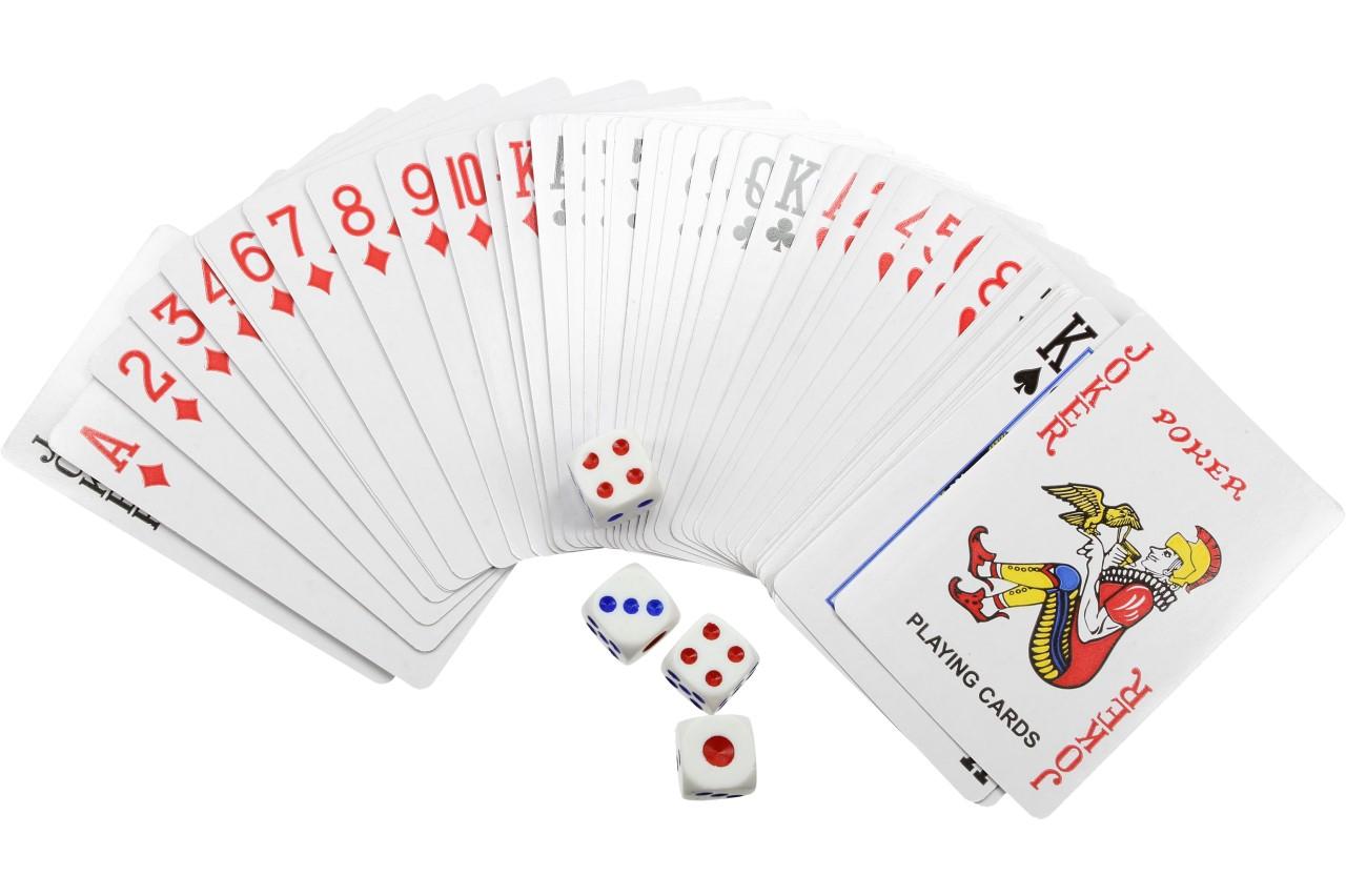 Poker je společenská hra. Karty jsou v pruhledné krabičce a zvlášť 2 balíčky karet v papirové krabičce + 4 kostky. Poker je hra určená především pro hry Poker a Wheels. Univerzální mezinárodní vzor umožňuje použití nejen pro klasický Poker či Texas Holdem, ale je vhodný pro celou paletu karetních her, třeba i pro kouzelnické účely. Balíček obsahuje červenou hromádku karet a modrou hromádku karet.