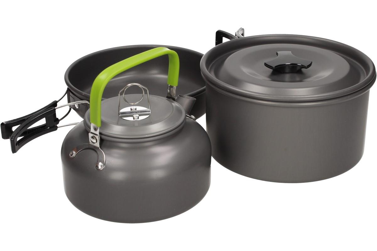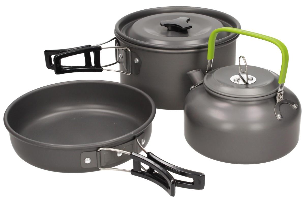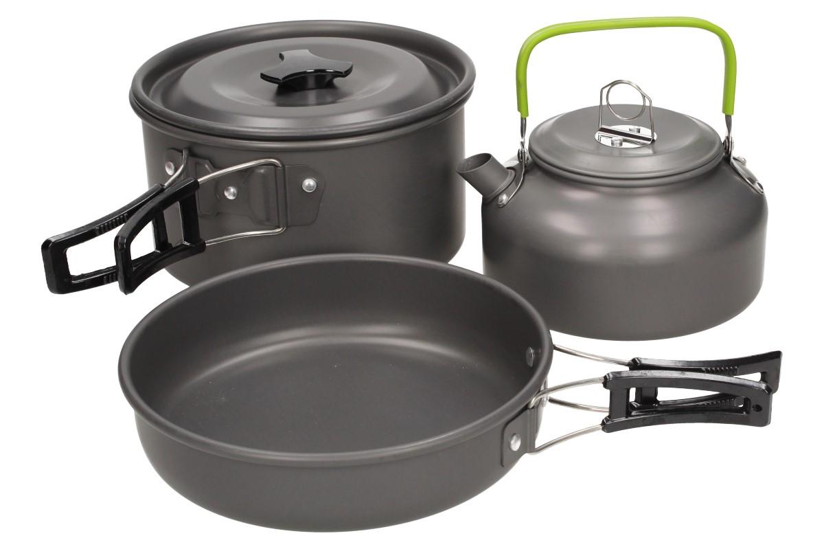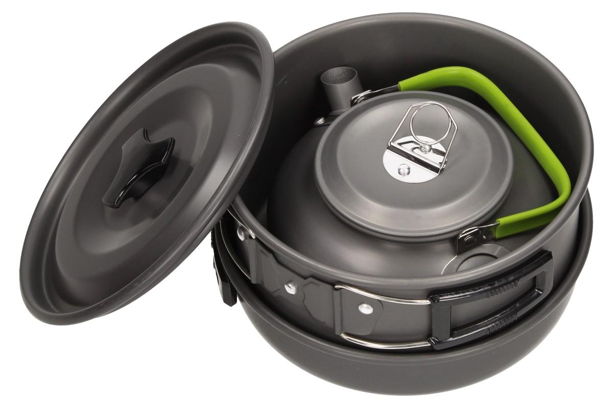 Jídelní kempingový skládací Set - nádobí pro kemping - obsahuje: 1x pánev o průměru 18cm a hloubce 4cm, hrnec s pokličkou o průměru 17cm a hloubce 9 cm a konev s pokličkou na přípravu teplých nápojů. Jídelní kempingový přenosný set je vhodný pro 2 až 3 dospělé lidi. Je vyroben z lehkého a odolného materiálu, který je pokrytý speciálním povrchem. Jídělní přenosný kempingový set dodáváme se síťkou, kterou lze zavěsit například na krosnu nebo baťoh.