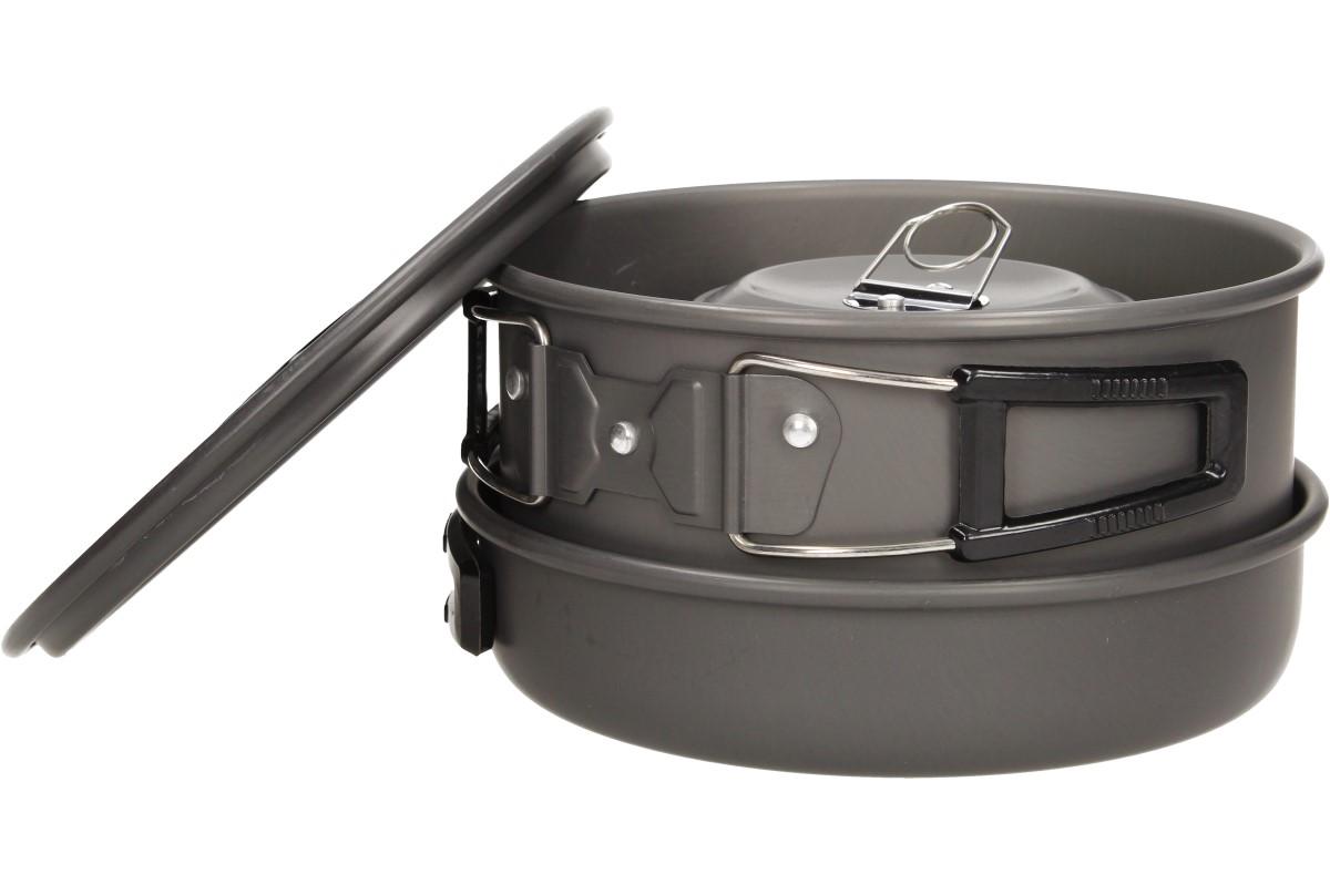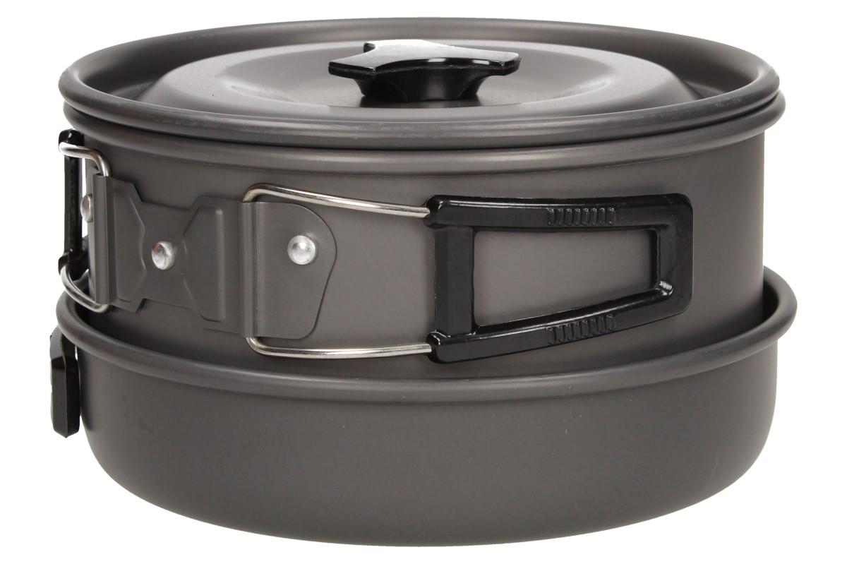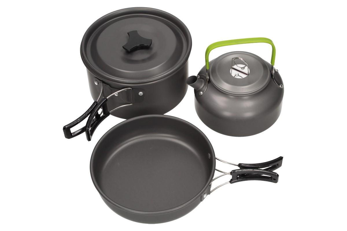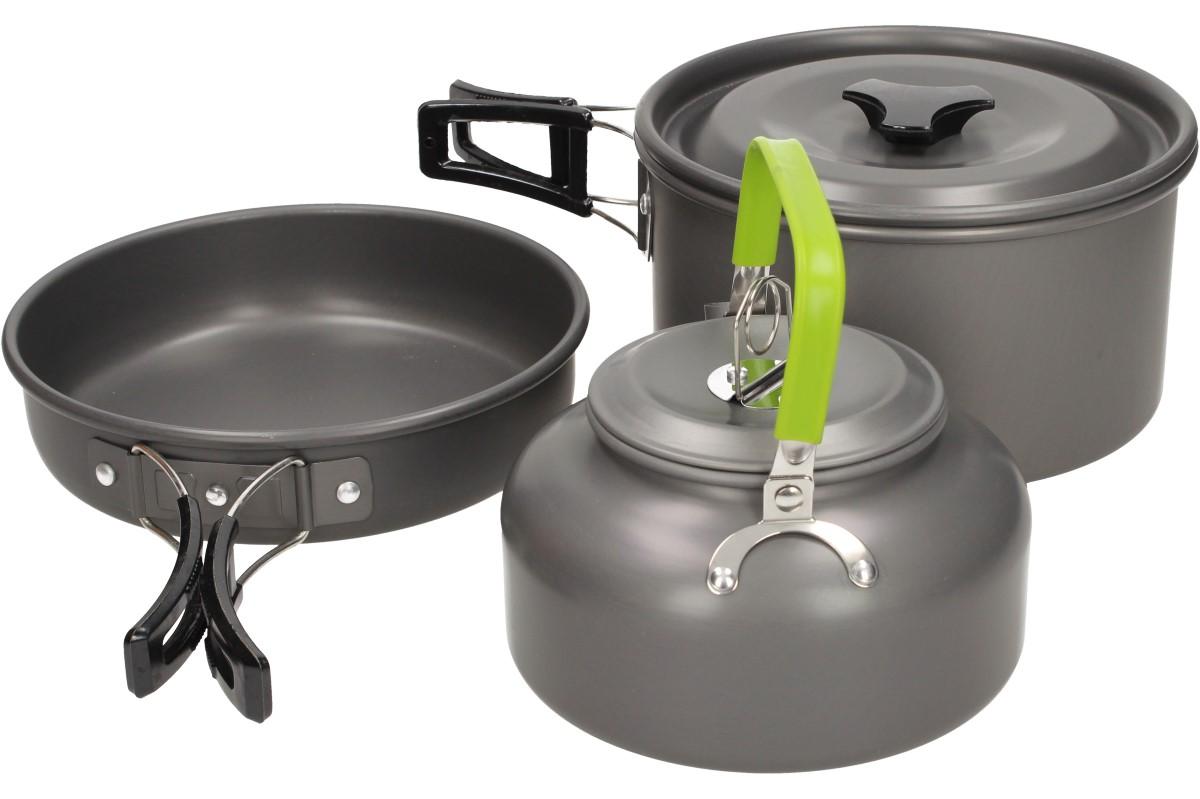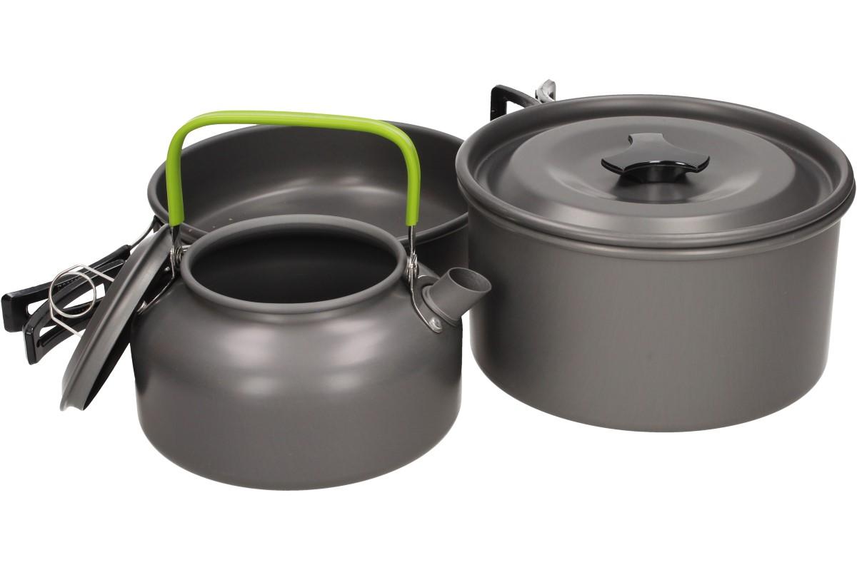 Jídelní kempingový skládací Set - nádobí pro kemping - obsahuje: 1x pánev o průměru 18cm a hloubce 4cm, hrnec s pokličkou o průměru 17cm a hloubce 9 cm a konev s pokličkou na přípravu teplých nápojů. Jídelní kempingový přenosný set je vhodný pro 2 až 3 dospělé lidi. Je vyroben z lehkého a odolného materiálu, který je pokrytý speciálním povrchem. Jídělní přenosný kempingový set dodáváme se síťkou, kterou lze zavěsit například na krosnu nebo baťoh.