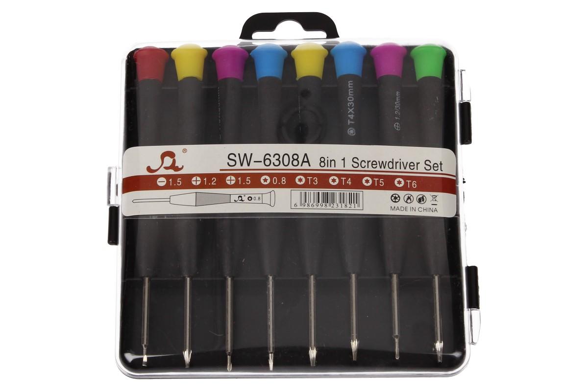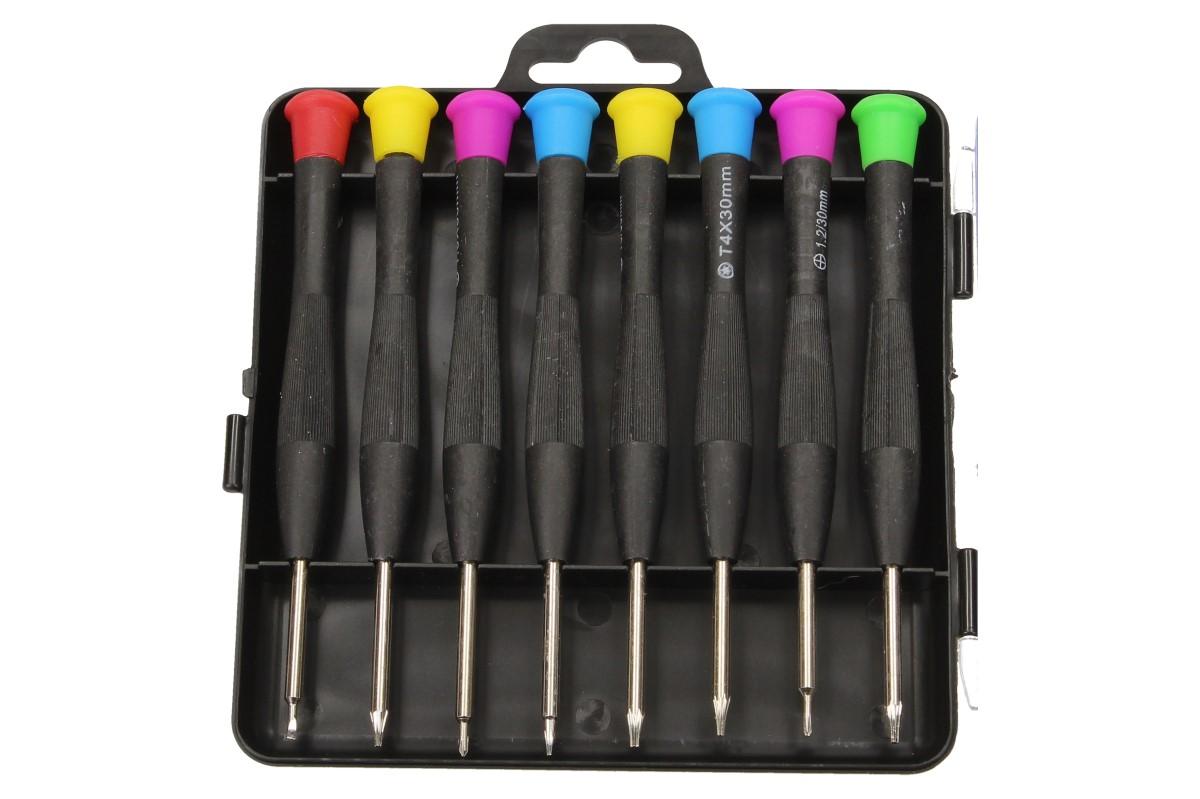 Sada mini šroubováků s osmi druhy různých šroubováků je nezbytnou pomůckou pro všechny domácí kutily. S touto sadou snadno vyšroubujete všechny pidi malé šroubky jako např. u mobilů, brýlý, počítače apod. Ergonomické pogumované držáky dobře padnou do ruky. Zákadní výbava všech domácností a dílen. Sada obsahuje 8 různých typů, které jsou rozlišeny barevnou korunkou.