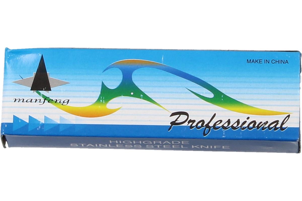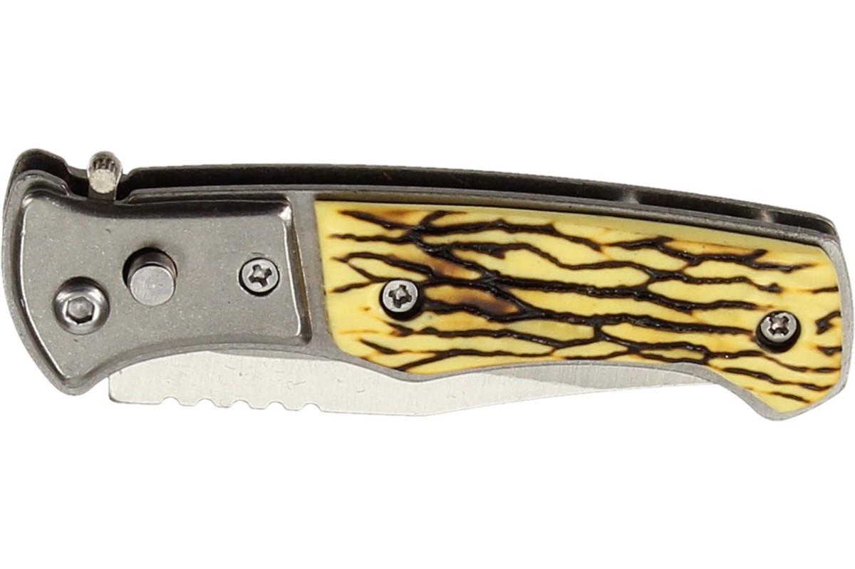 Špičkový vystřelovací nůž se žlutou střenkou a černými pruhy o délce 15 cm v rozloženém stavu, pojistkou a poutkem na přichycení. Tento kapesní skládací vystřelovací nůž disponuje s silnou vystřelovací pružinou a spouštěcím mechanismem (tlačítko), umístěným na jedné straně nože.