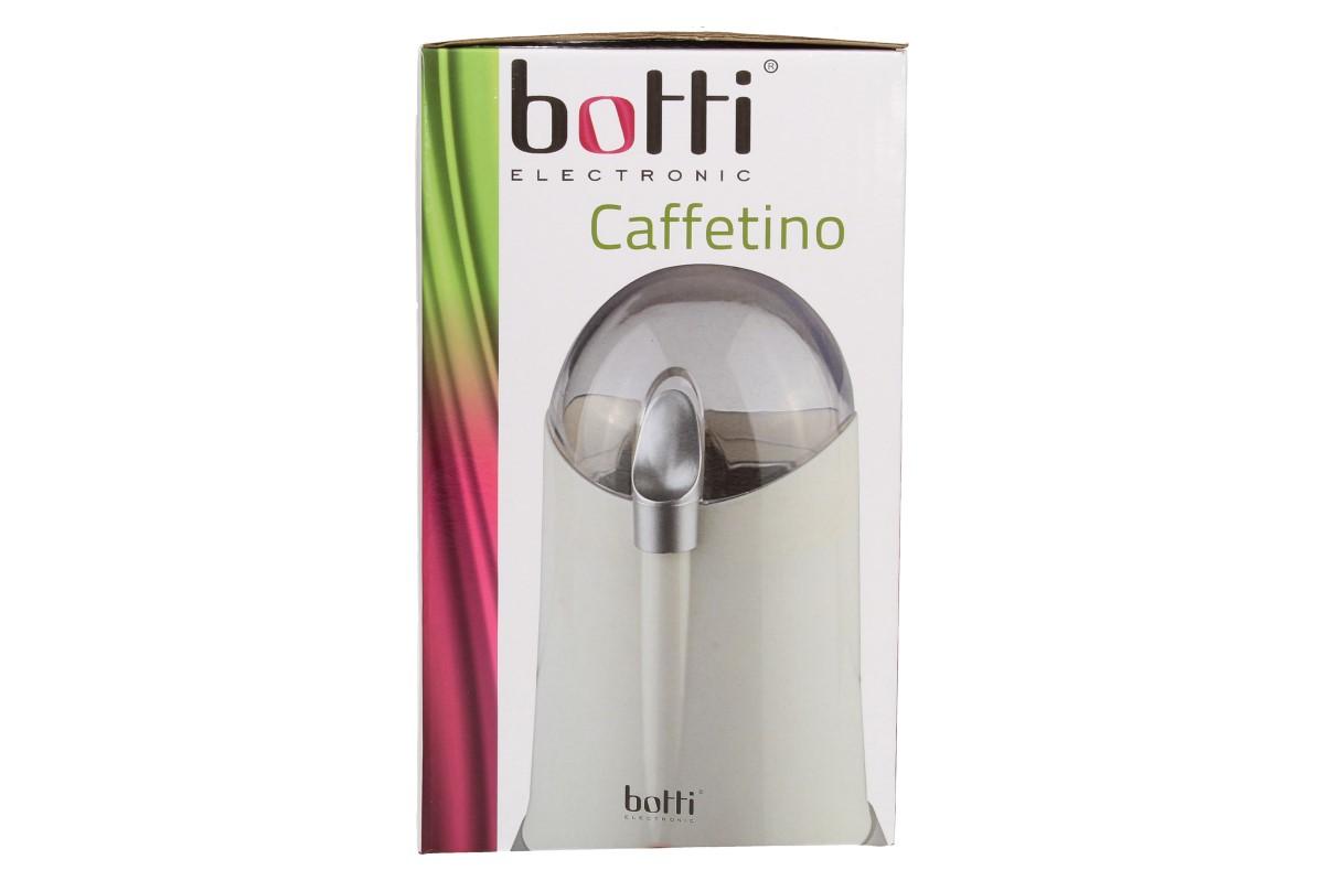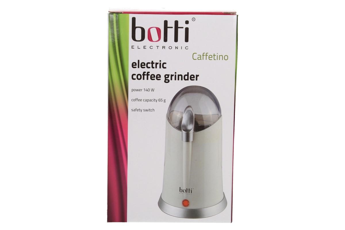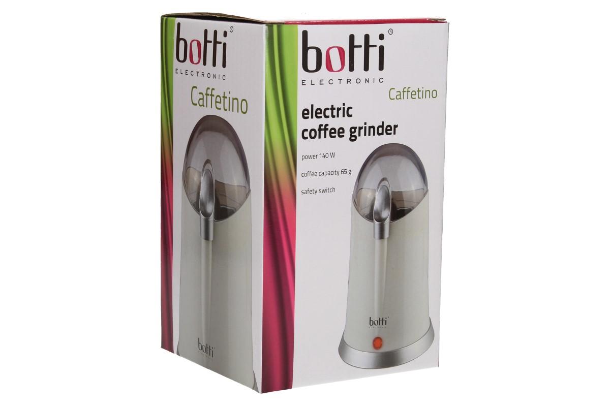 Funkční a estetický mlýnek na kávu Botti Caffetino s nerezovou nádobou a průhledným víkem s bezpečnostním zámkem, má kapacitu 65 g kávy a příkon 140 W. Mlýnek je vhodný také na mletí ořechů a koření. Jednoduché používání potěší každého milovníka čerstvé kávy.