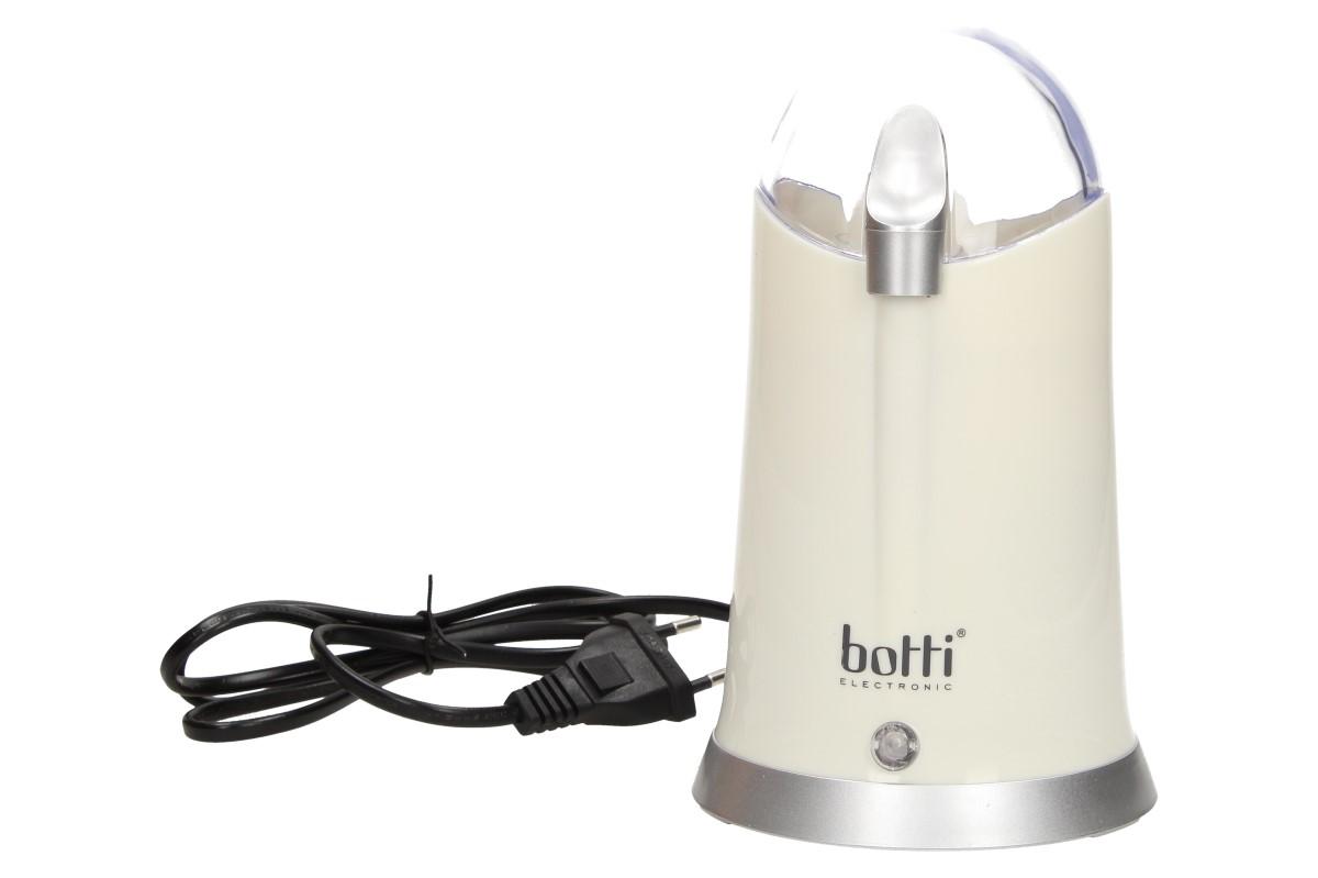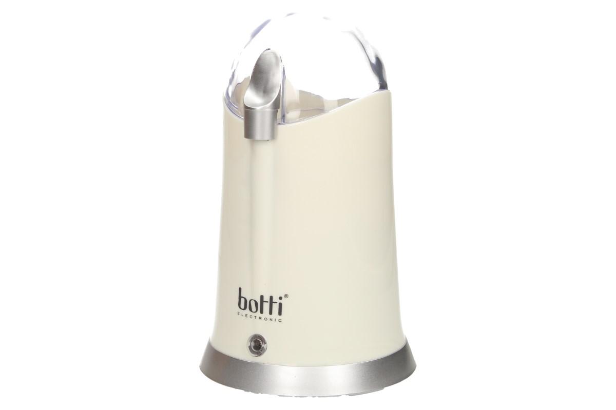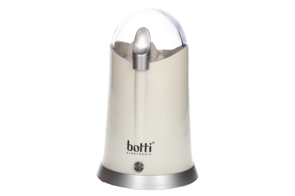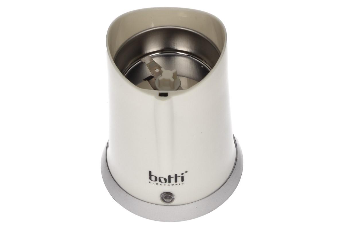 Funkční a estetický mlýnek na kávu Botti Caffetino s nerezovou nádobou a průhledným víkem s bezpečnostním zámkem, má kapacitu 65 g kávy a příkon 140 W. Mlýnek je vhodný také na mletí ořechů a koření. Jednoduché používání potěší každého milovníka čerstvé kávy.
