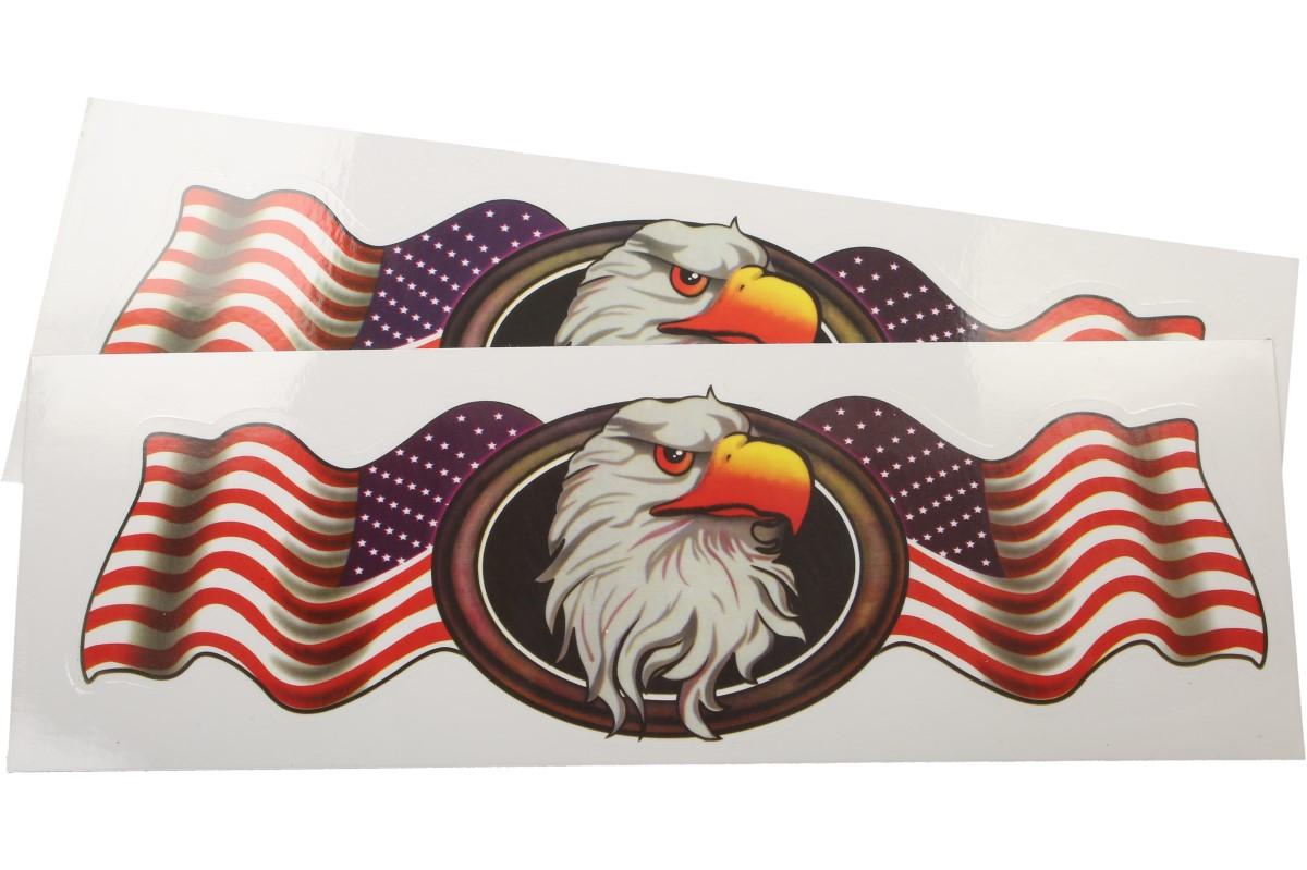 Samolepka USA orlice 2 ks 30x10cm průhledná - vhodná samolepka na americké vozy, motorky, garáže. Symbol Orla odráží symbol americké svobody. Lepíte pouze samolepku, pozadí je ořezané a přesah kolem obrázků průhledné.