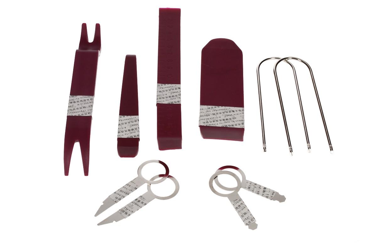Se sadou pro montáž a demontáž interiéru vozidel můžete bezpečně namontovat audiozařízení, nebo demontovat vnější a vnitřní obložení, palubní desku, atd. Plastová konstrukce nástroje zabraňuje jakémukoli poškození vozidla. Ideální pro demontáž a montáž rádií, mřížek reproduktorů, panelů, LCD obrazovky, palubní desky, obložení, lišty, dveřních panelů. Nástroje jsou navrženy tak, aby vyhovovaly každému automobilu.