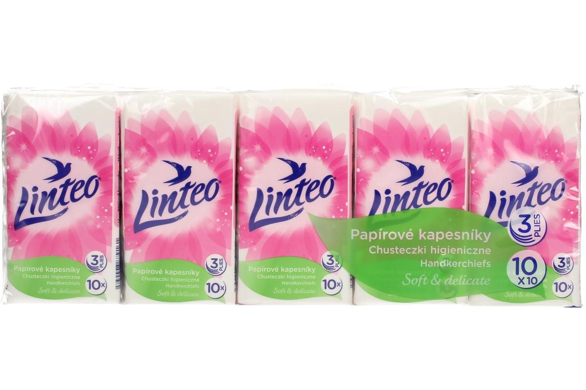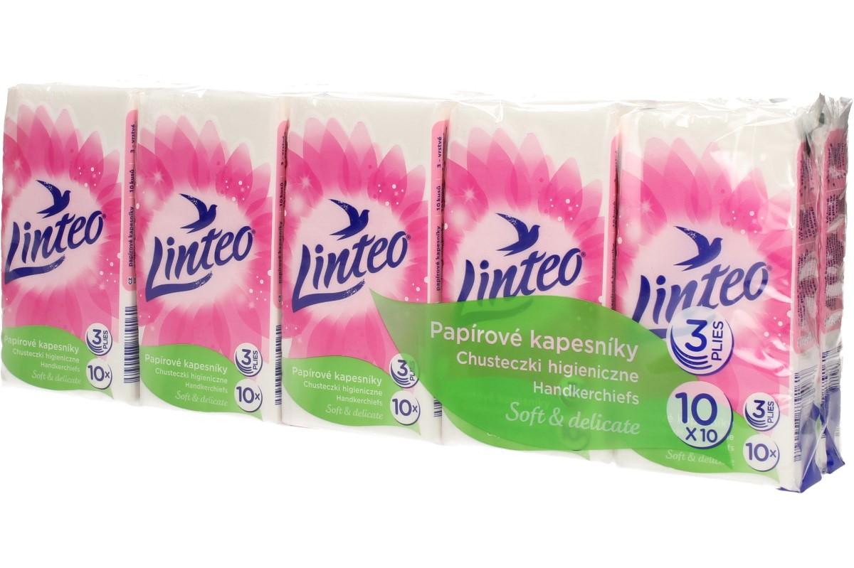Papírové kapesníky Linteo 3vrstvé 10x10 zaručí vysokou jemnost, měkkost a pevnost. V období chřipek, rýmy a alergií je vždy vhodné mít po ruce kapesníčky, které vám nepodráždí a neodřou nos. Balení obsahuje 10 balíčků po 10 kapesnících, které jsou vyrobeny ze 100% celulózy a jsou neparfémované.