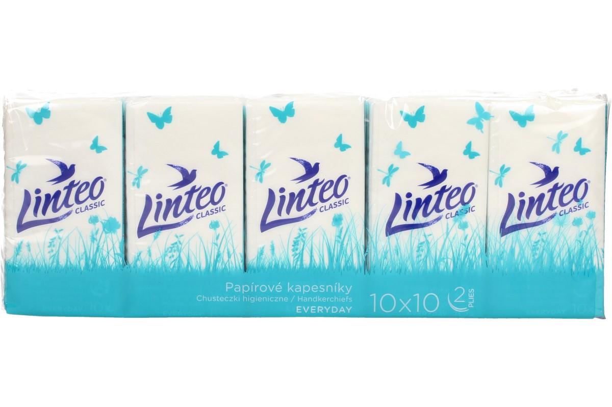 Papírové kapesníky Linteo 2vrstvé 10x10 zaručí vysokou jemnost, měkkost a pevnost. V období chřipek, rýmy a alergií je vždy vhodné mít po ruce kapesníčky, které vám nepodráždí a neodřou nos. Balení obsahuje 10 balíčků po 10 kapesnících, které jsou vyrobeny ze 100% celulózy a jsou neparfémované.