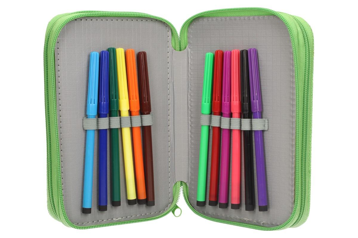 - Obsahuje: tuhy do pentilky, pentilku, černou propisku, pravítko, ořezávátko, gumu, malý bloček který může posloužit jako úkolníček, 12 fixů základních barev a 12 pastelek.
