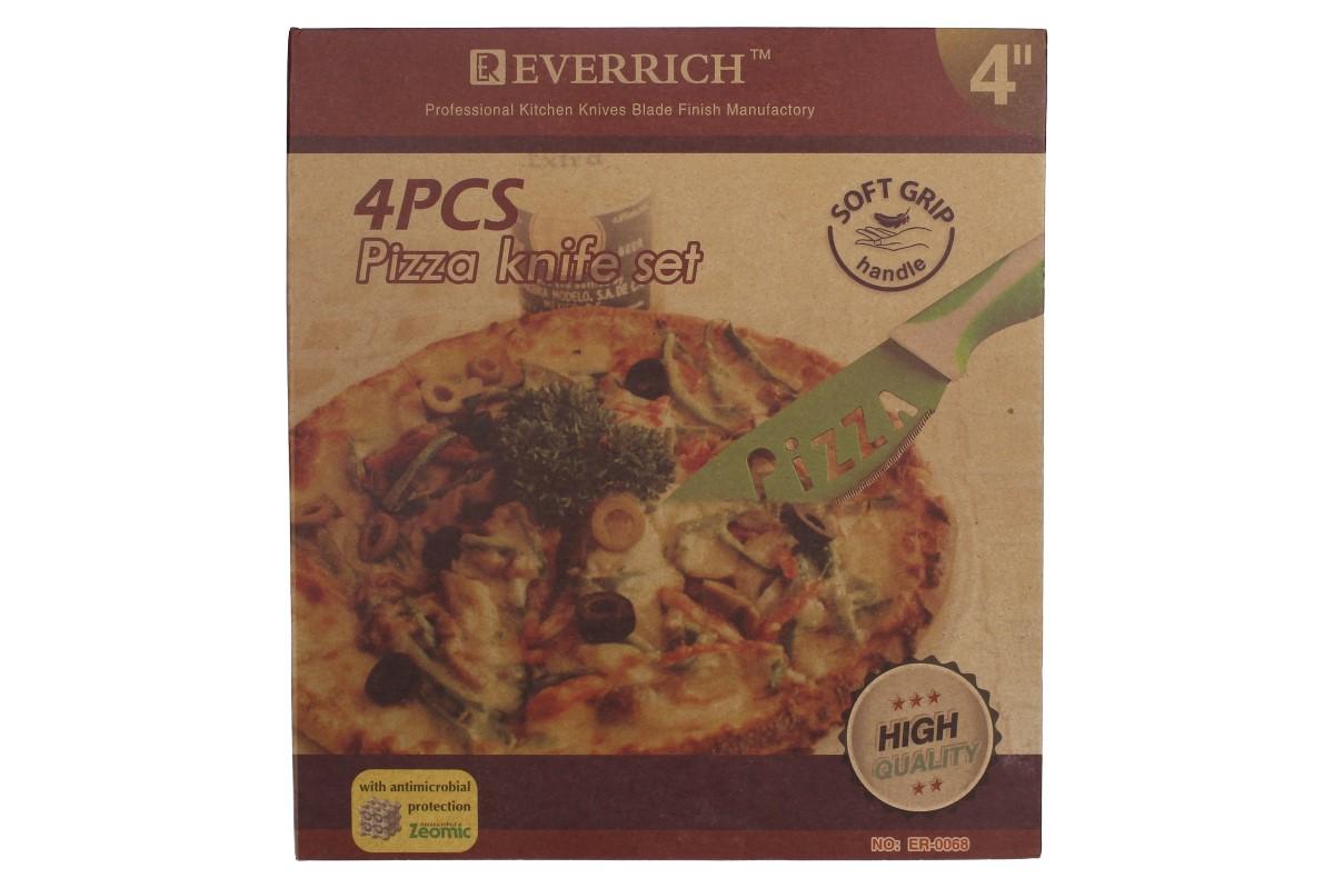 Sada pizza nožů Everrich. Máte rádí pizzu? Zkoušíte si pizzu sami upéct? Máme produkt přímo pro vás. Tato sada nožu je vyrobena z kvalitní oceli, která odolá přilepení od pokrmů(sýr, rajče atd). Délka jednoho nože je 20cm, délka čepele s vkusným nápisem pizza je 9 cm. Nože mají měkké ergonomické pogumované madla, které zaručují pohodlné použití. Protekce proti mikrobům. Dodáváno v dárkové kartonové krabici.