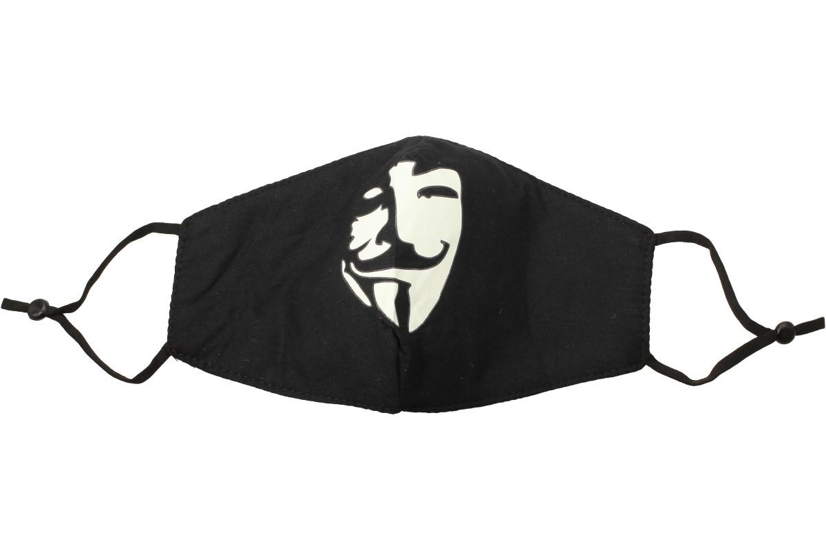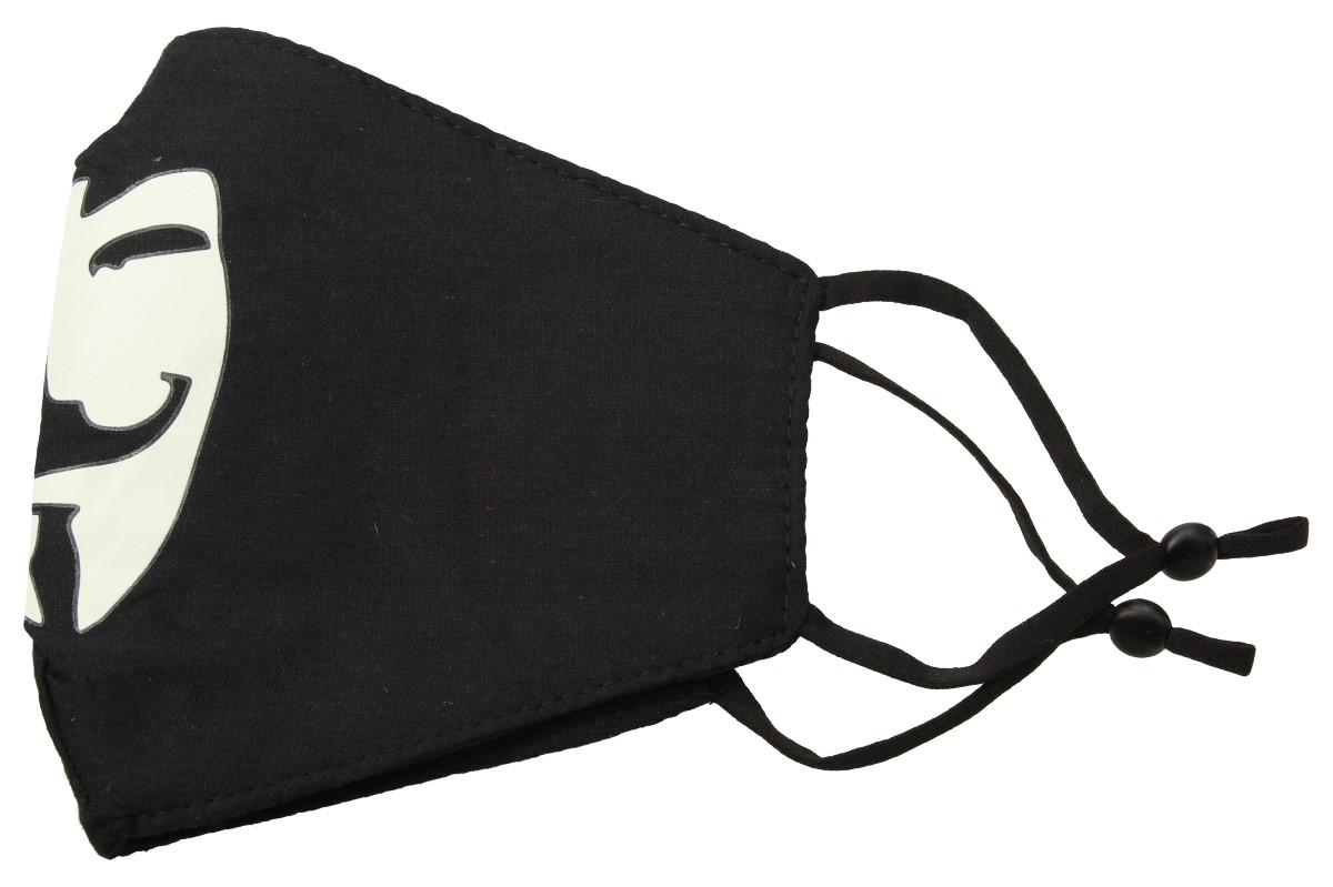 Už vás nebaví jednorázové sterilní roušky, které mají všichni? Roušku se vzorem tajemné masky anonymous, která svítí ve tmě jen tak na někom neuvidíte! Ideálně plní nároky pro jednoduché nasazení při práci, procházce znečištěným prostředím, infekčním prostředí apod.. Když musíme nosit roušku tak ať stojí za to. Splní požadavky nařízení vlády a ještě dobře vypadá. Vysoká prodyšnost umožňuje pohodlné dýchání. Rouška se skládá ze 2 vrstev pevné látky a slabé výplně. Velikost je univerzální, ale lze nastavit délku gumiček pomocí gumového kroužku.