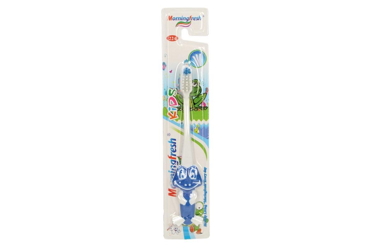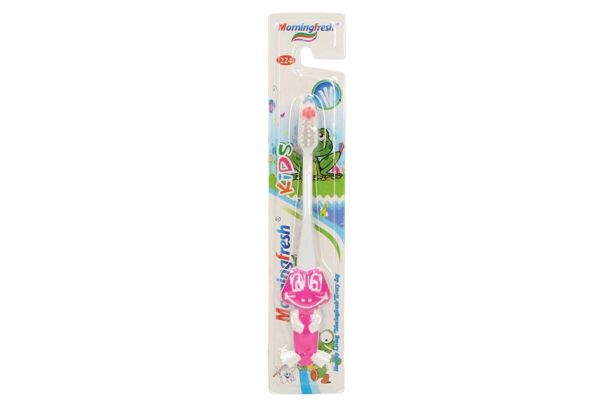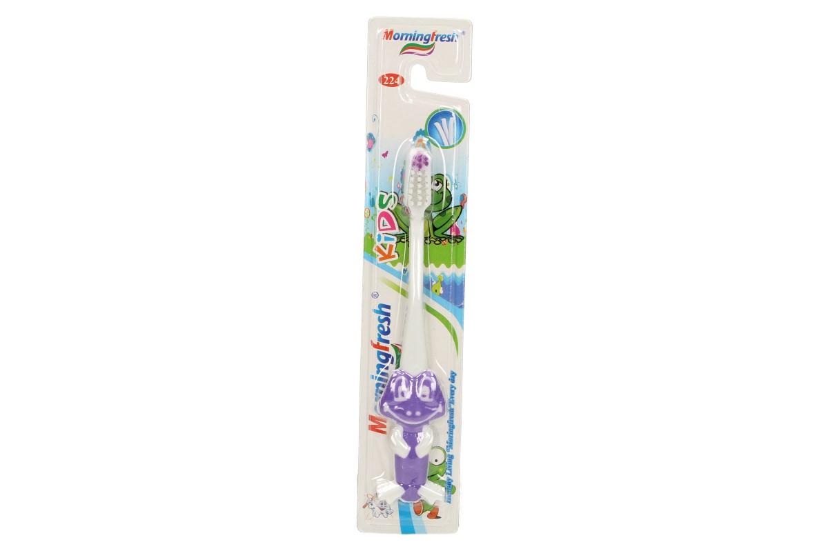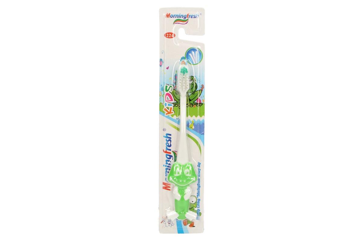 Dětský zubní kartáček žába je vybaven elastickými, gumovými štětinami, které kromě čištění masírují zubní dáseň. Rukojeť tohoto zubního kartáčku je provedena ve formě žáby, která pro dítě dělá čištění zubů fascinujícím herním procesem. Tento model zubního kartáčku je určen pro děti od 2 do 7 let. Od raného dětství je nutné sledovat, jak si vaše dítě čistí chrup a naučit ho jak na to. Tím předejdete problémům spojené se zubními kazy, atd. Dodáváno ve čtyřech barvách: růžová, modrá, zelená a fialová.