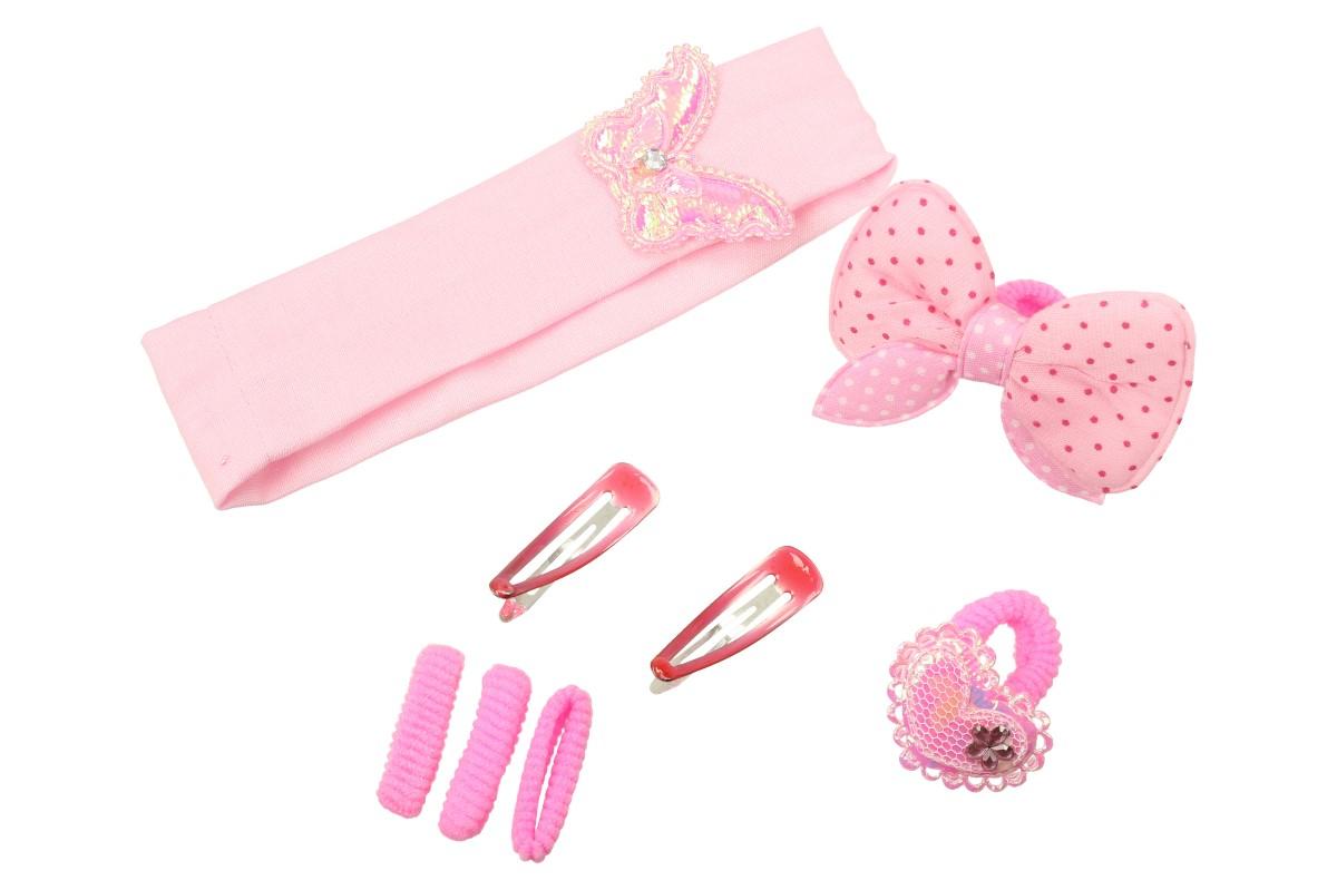 Čím udělat radost malé princezně? Kupte jí tuto sadu vlasových doplňků v růžové barvě! Tato sada obsahuje vše, co holčičky potřebují: 3 gumičky, 2 sponky, čelenku s motýlkem, 1 gumičku s třpitivým srdíčkem a gumičku s velko mašlí. Gumičky nemají žádné kovové spoje, tudíž dítě nebude nic tlačit. Malým parádnicím tak můžete vytvořit rozkošné účesy do školky nebo do školy.