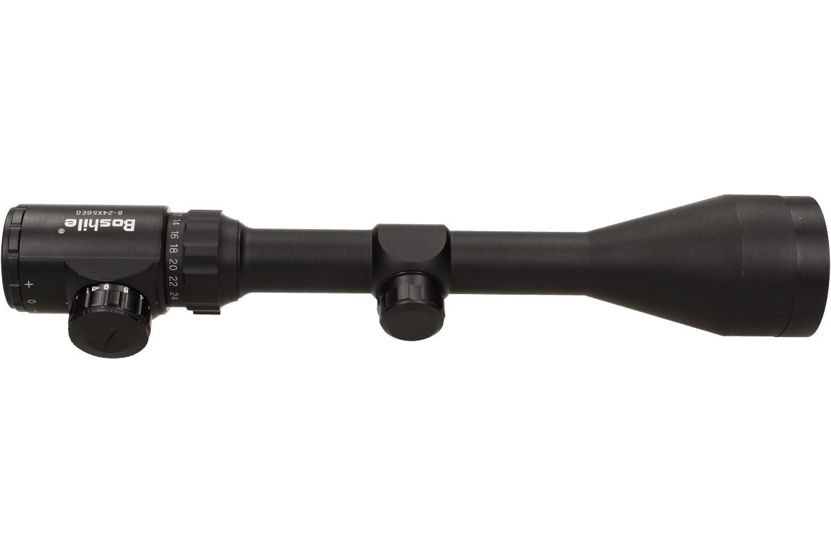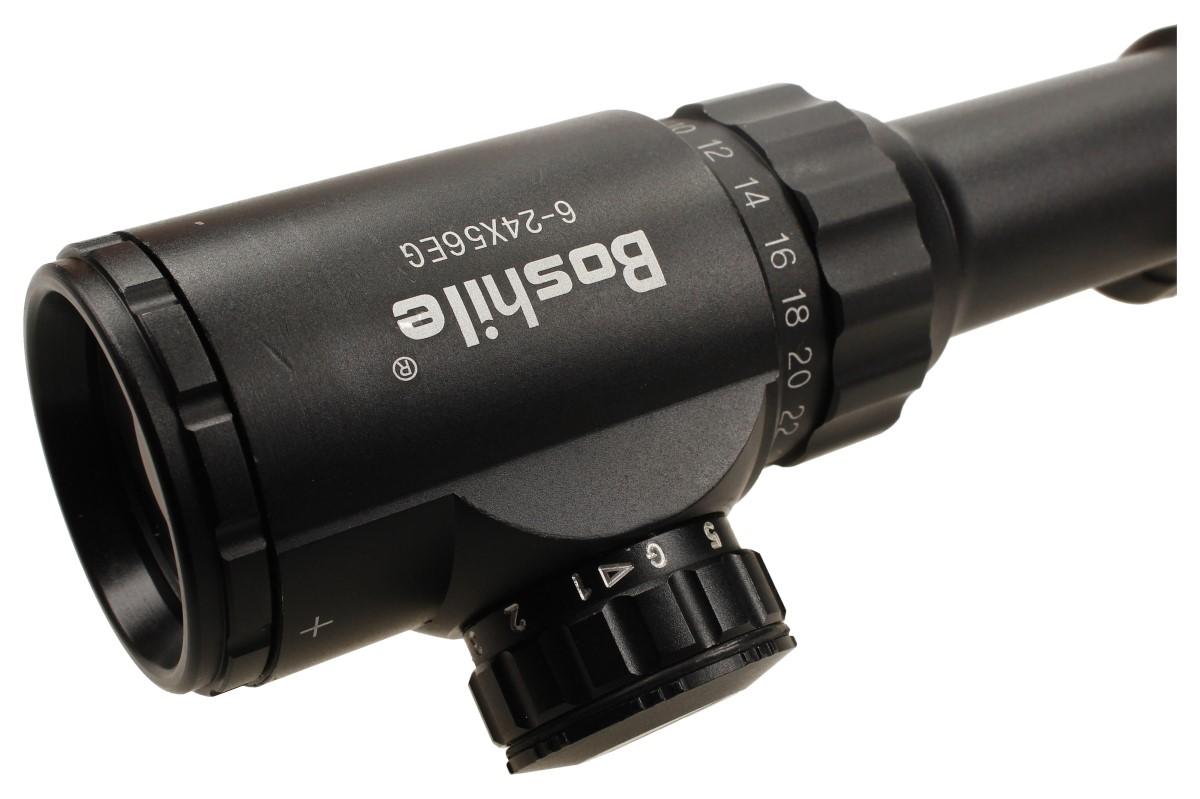 Puškohled 6-24x56 EG Boshile je optický zaměřovač určený pro střelbu na větší vzdálenosti. Tento konkrétní model má proměnné zvětšení v rozsahu od 6x do 24x a průměr objektivu 56mm. Díky tomuto zvětšení umožňuje střelcům dosáhnout vysoké přesnosti a vidět cíle na velké vzdálenosti s vysokou jasností a kontrastem. Puškohled obsahuje funkce, jako jsou možnost manuálního zaostření, nastavitelná osnova a možnost nastavení výšky a elevace zaměřovače. EG značí funkci "Extend Glass" což znamená, že použitá skla jsou nízké disperze, která umožňují jasnější a kontrastnější obraz. Tento typ puškohledu je vhodný pro střelbu na dlouhé vzdálenosti a je oblíbený mezi střelci, kteří hledají vysokou kvalitu a výkon za přijatelnou cenu.