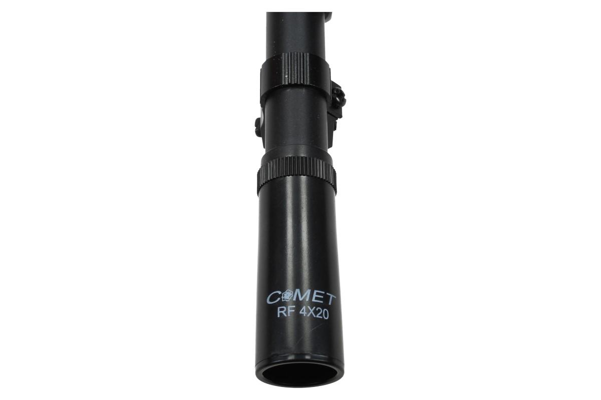 Puškohled COMET RF4X20C obsahuje objektiv 20 mm a je vhodný na všechny druhy vzduchových zbraní s 11mm lištou. Jeho optika je určená pro rychlé zaměřování na krátké vzdálenosti, a uživateli poskytuje dobrou viditelnost i za soumraku či mlhy. V optice má záměrný TV křížek, díky kterému máte lepší periferní vidění a následně i přesnost střelby. Korekce je předpokladem pro velmi přesnou střelbu na vzdálenosti do 100m. Všechny části optické soustavy jsou opatřeny vícevrstvým povlakem.