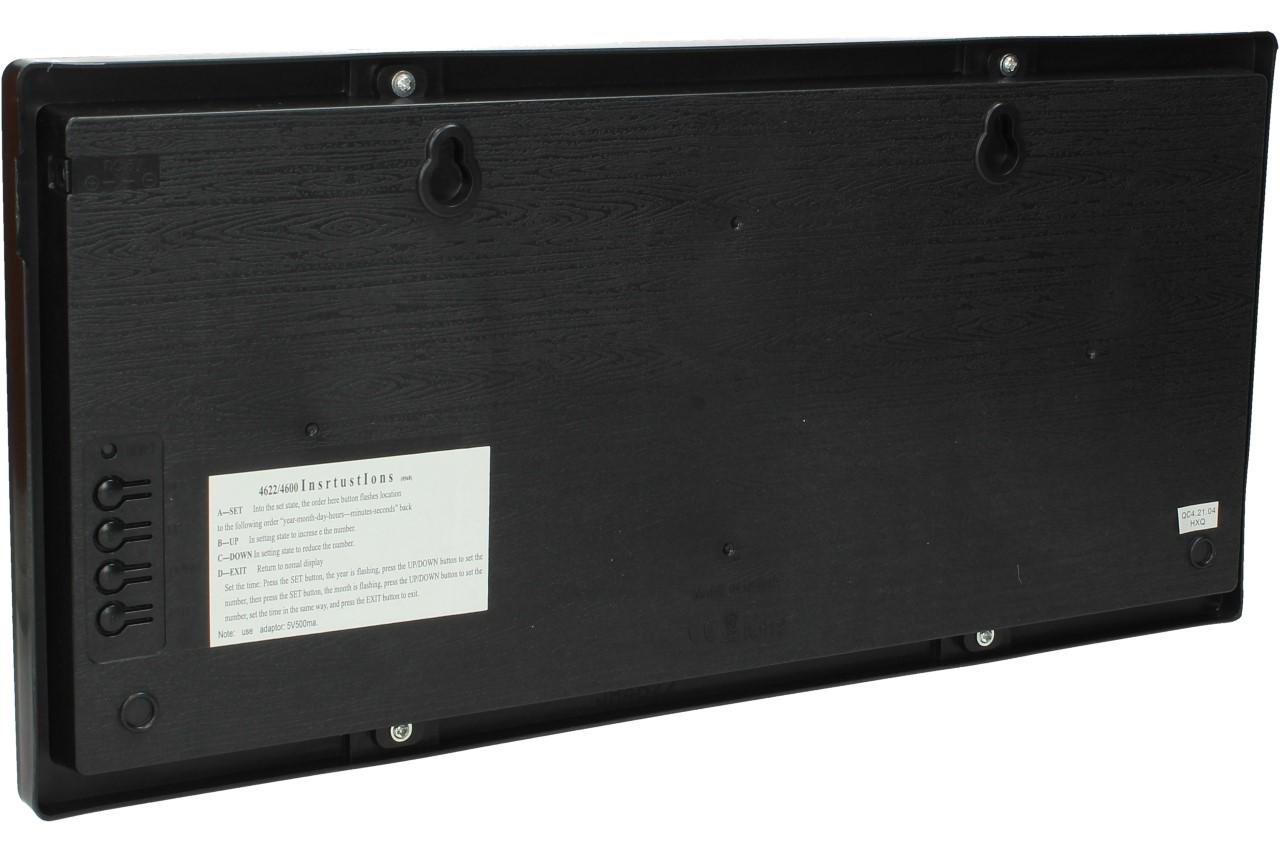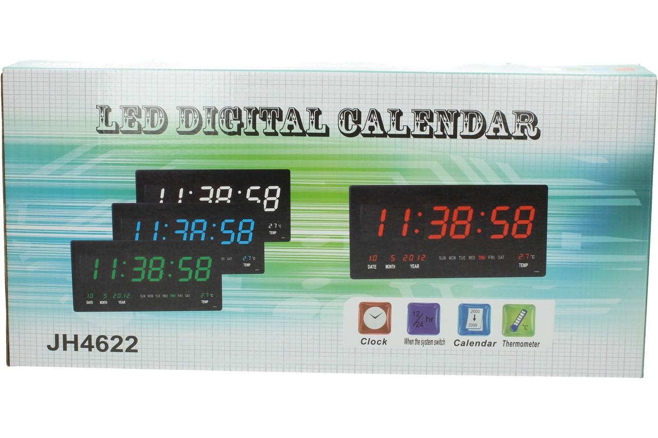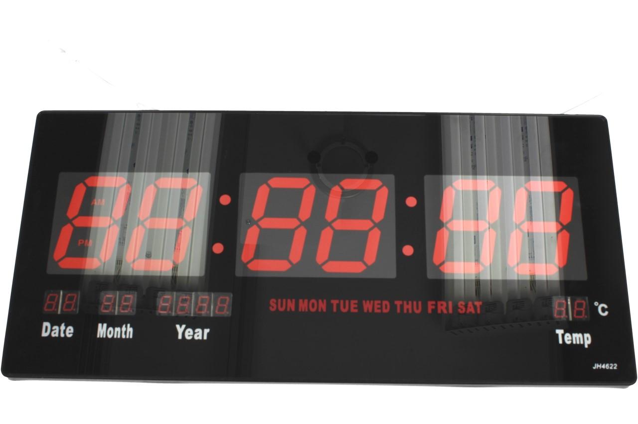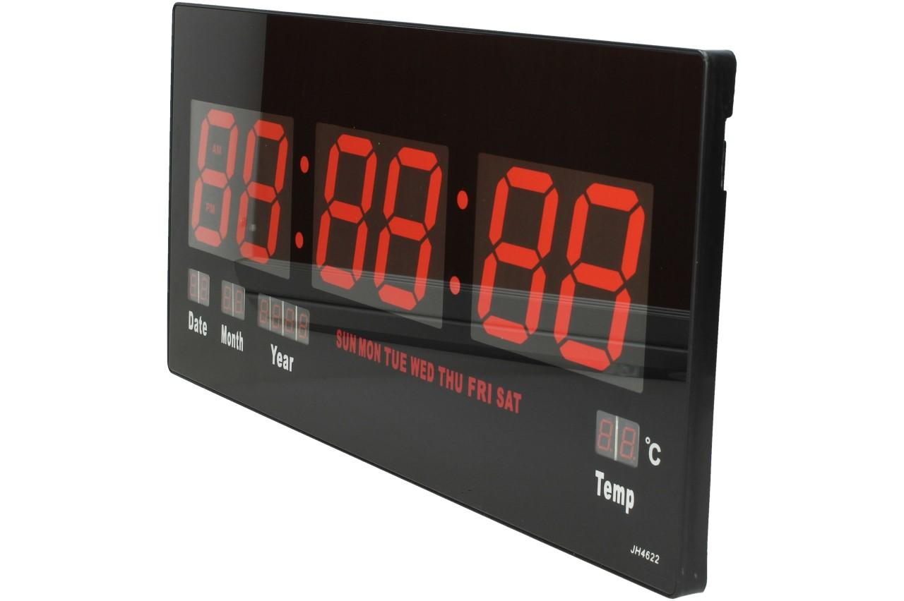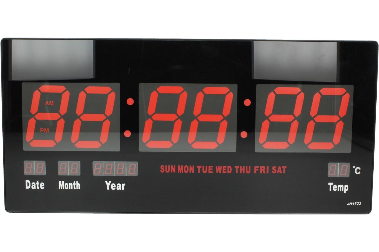 Tyto digitální hodiny JH4622 Vás překvapí svou jednoduchostí a přehledným LCD displejem, který je podsvícený červenou barvou a dodá hodinám zajímavý vzhled. Obsahují pouze 4 tlačítka na celou manipulaci a návod, jak na to je nalepen ze zadní strany hodin. Můžete je pověsit na zeď, díky otvoru na zadní straně nebo jen o něco opřít. Jsou vhodné do bytů, kanceláří, vstupních chodeb, prodejen, čekáren atd. Na displeji se vám dále zobrazuje pokojová teplota, datum i s rokem, jaký je den a samozřejmě čas. Velikost čísel je 7,5 cm, tudíž se už nemůžete vymluvit na to, že jste přehlédli čas. Napájení provádíte pomocí 5V adaptéru, který je součástí balení.