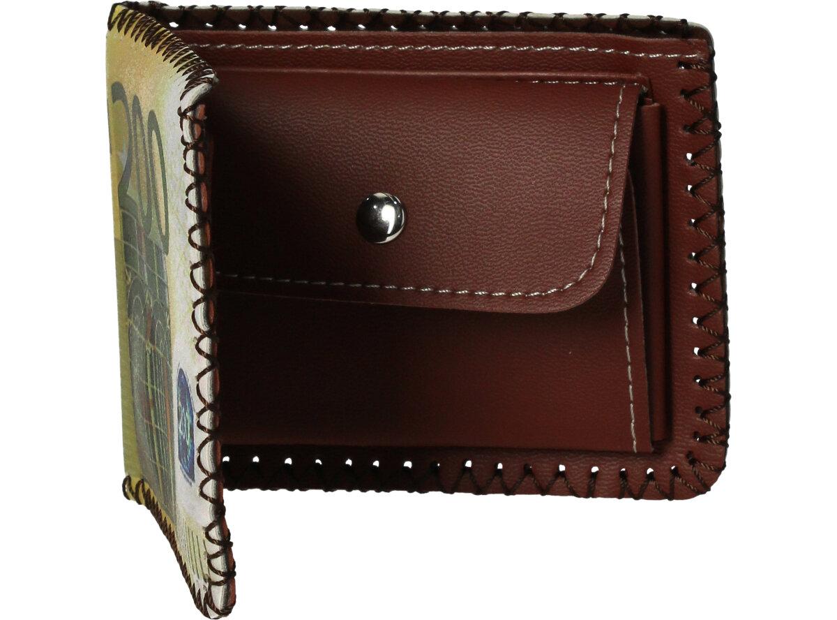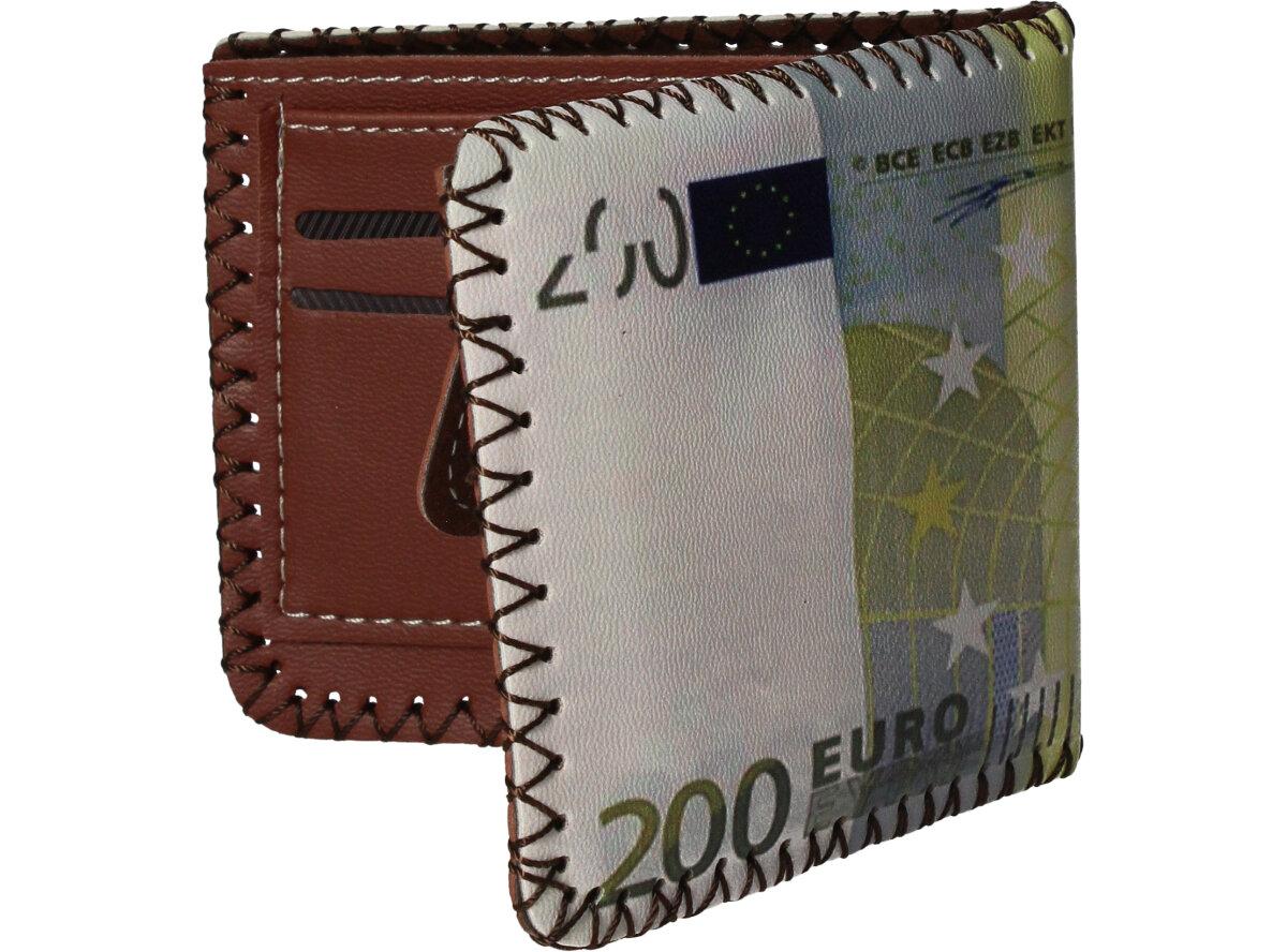 Dobrá peněženka za málo peněz s motivem 200 EUR bankovky, nejen na papírová platidla. Disponuje přihrádkami na kreditní karty, občanku, řidičský průkaz a další.