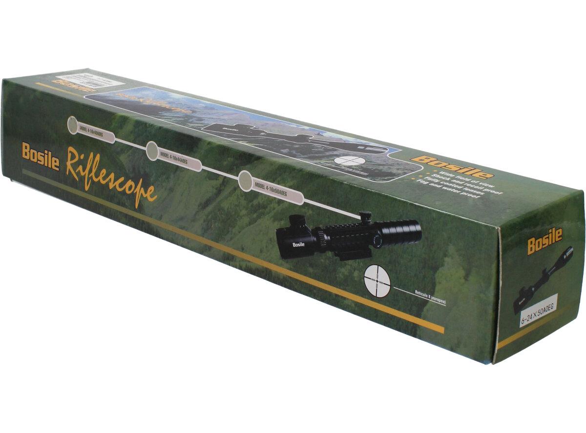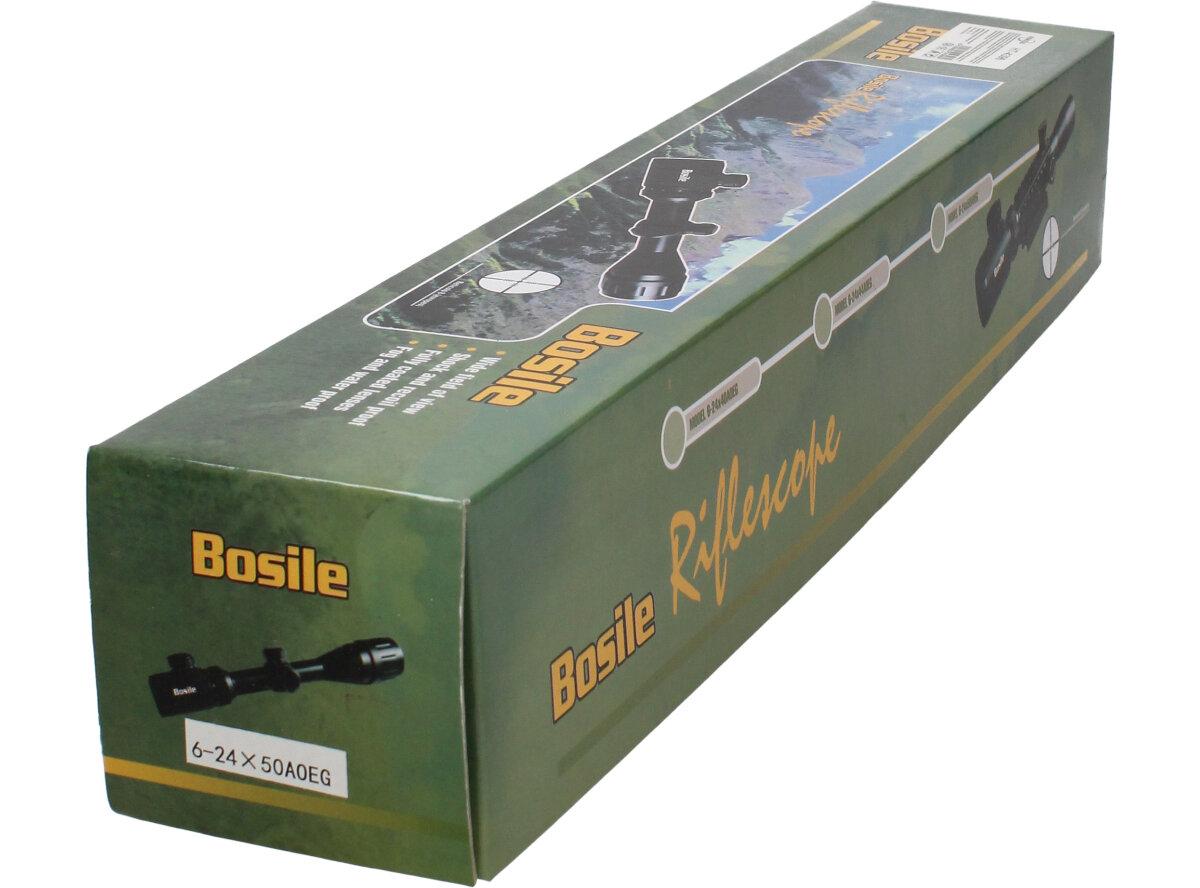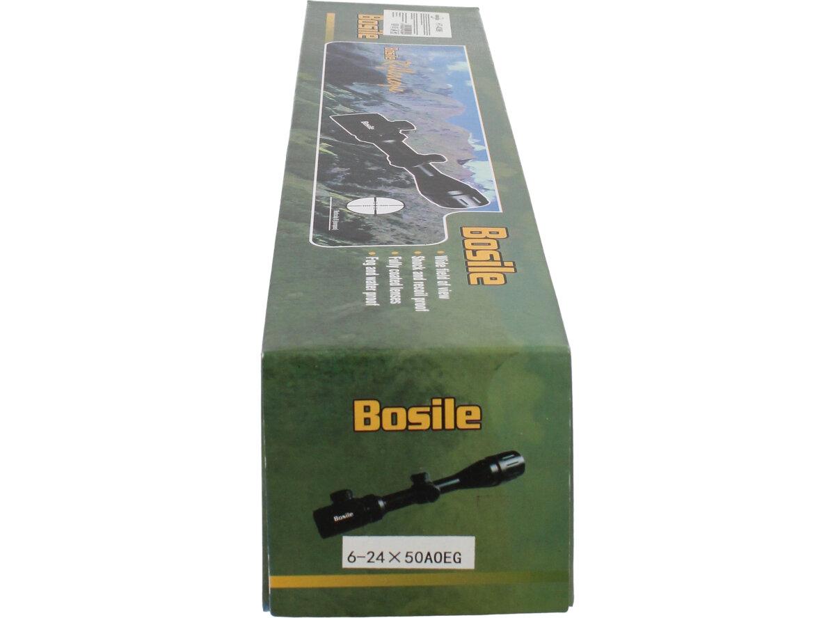 Puškohled BOSILE 6-24x50 AOEG. Objektiv o průměru 50 mm zaručuje kvalitní obraz i ve zhoršených světelných podmínkách. Korekce 1/4" 100 yds je předpokladem pro velmi přesnou střelbu na střední vzdálenosti. Pro použiti za šera a v noci ,osnova je podsvícena. Odolný proti zamlžování a rázům. Všechny části optické soustavy jsou opatřeny vícevrstvým povlakem. Použití materiálů vysoké kvality pro všechny mechanické součásti puškohledu.