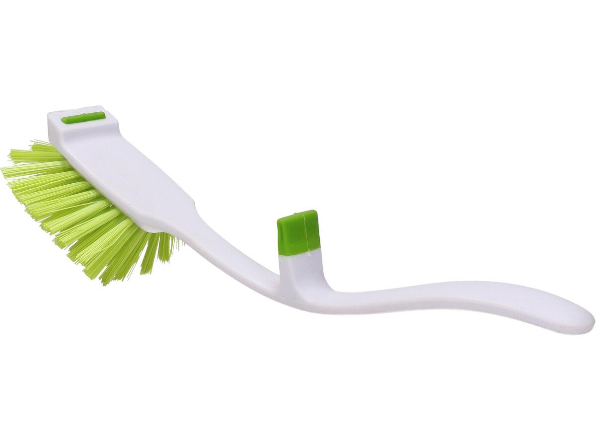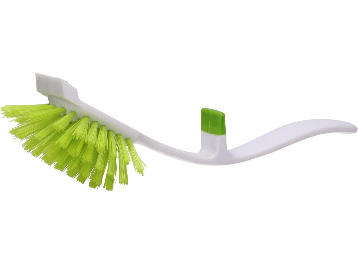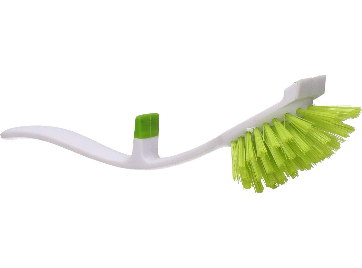Kvalitní kartáč na drhnutí zelený s aerodynamickou rukojetí a navíc se dá pověsit třeba na hranu kýblu