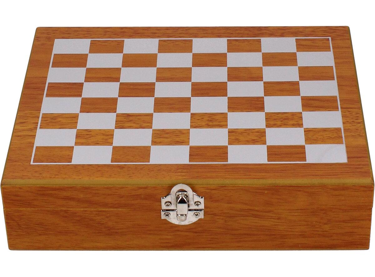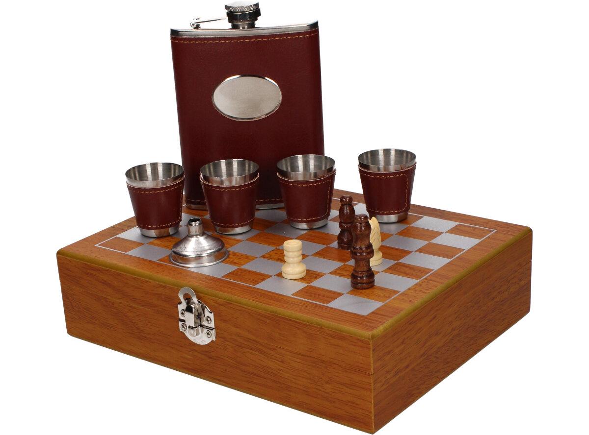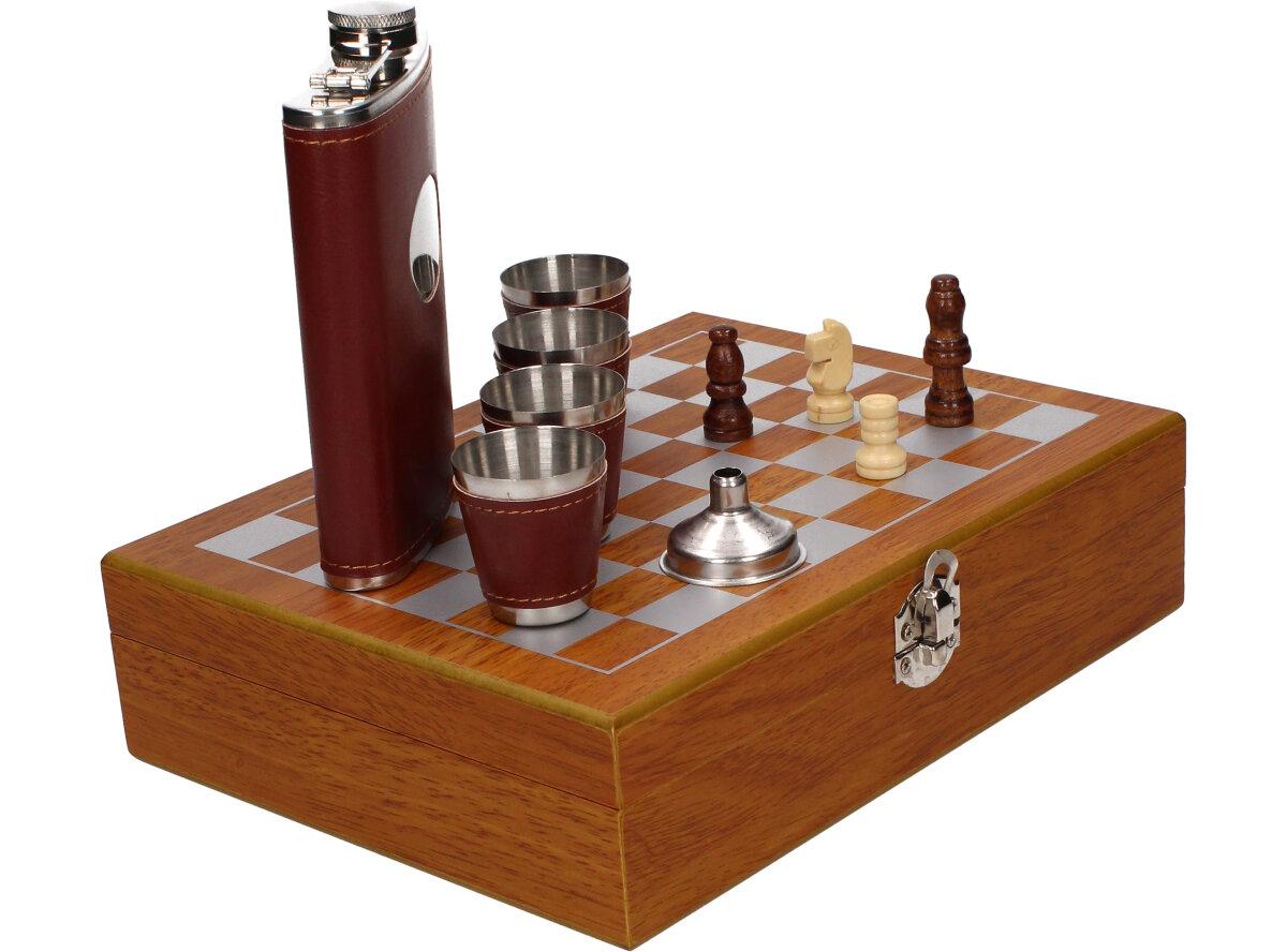 Dárková sada placatka šachovnice s panáky v kožence je nádherný a zajímavý dárek pro vaše blízké, rodinu i kamarády. Sada je vhodná i jako dárek pro milovníky a hráče šachových her. Sada obsahuje: placatku, 4 x panák, placatka, nálevka, šachy a hrací deska v provedení kufříku. Kufřík je dodáván v dřevěném provedení.