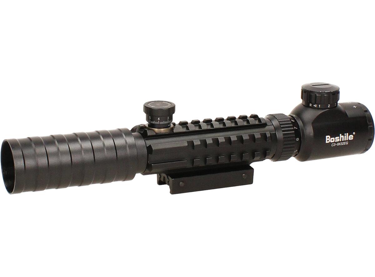 Puškohled Bosile C3-9x32EG s montážní jednotkou na 11mm lištu . Záměrná osnova je v druhé fokální rovině má dvojí podsvícení červené a zelené, široké zorné pole, plně antireflexní, mlze a vodě odolný, kryt optiky. Délka 300 mm, o 42,30 mm, váha 0.5 kg (iz montáží). Kvalitní puškohled vhodný na všechny druhy vzduchových, airsoftových ale i loveckých zbraní. Dodávané s ochrannými kryty na sklíčka. Po upevnění puškohledu na zbraň je možné, že zaměřování a střelba nebude přesná. Pokud tak bude, třeba si puškohled nastavit pomocí dvou nastavitelných koleček. K puškohledu je dodáván i imbusový klíč na upevnění.