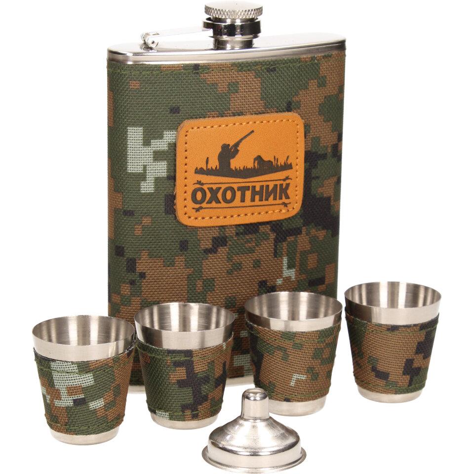 Dárková sada placatka khaki, čtyřmi panáky a nákevkou je vyrobena z nerezového materiálu a je vhodná jako vkusný dárek.