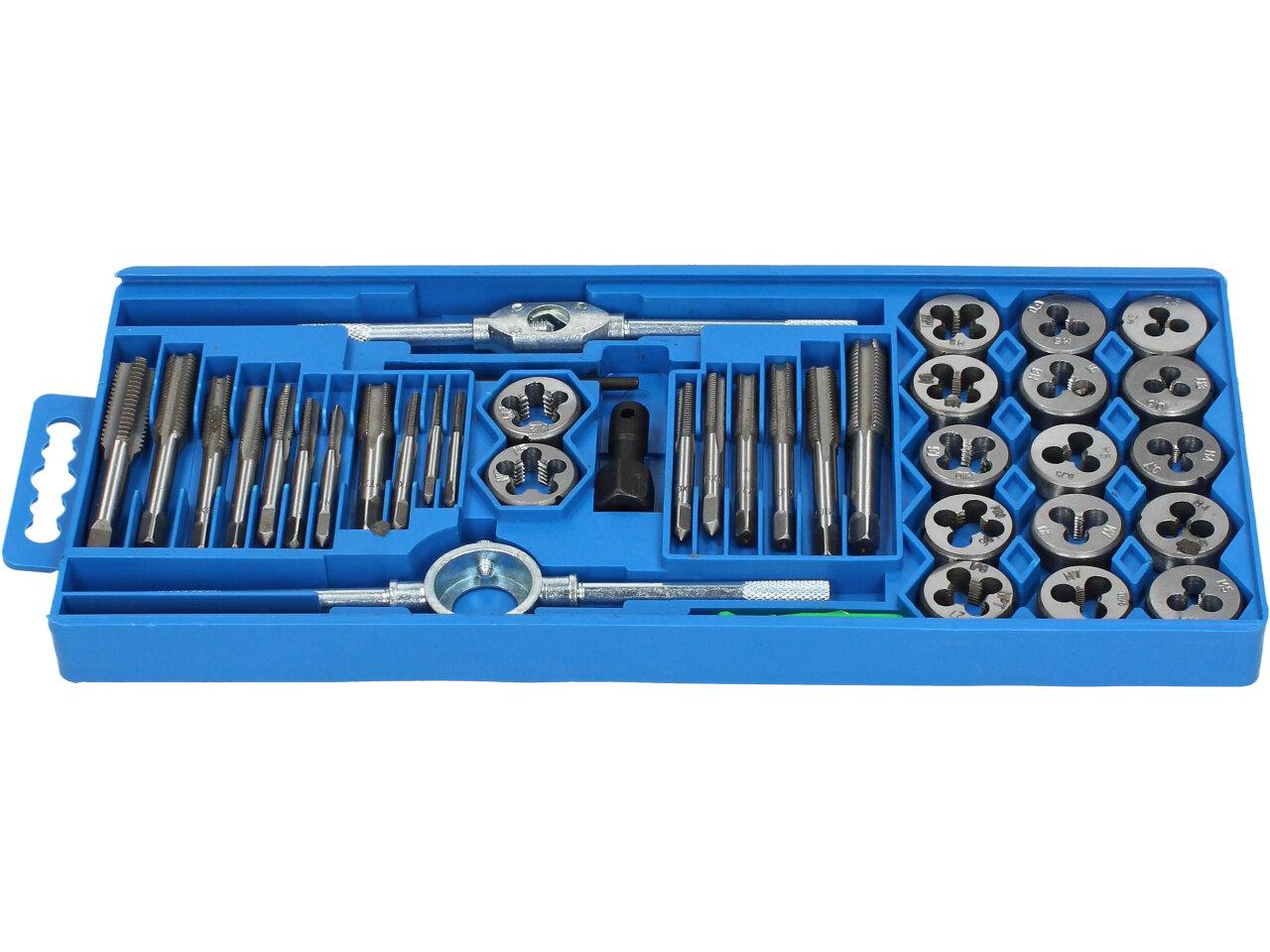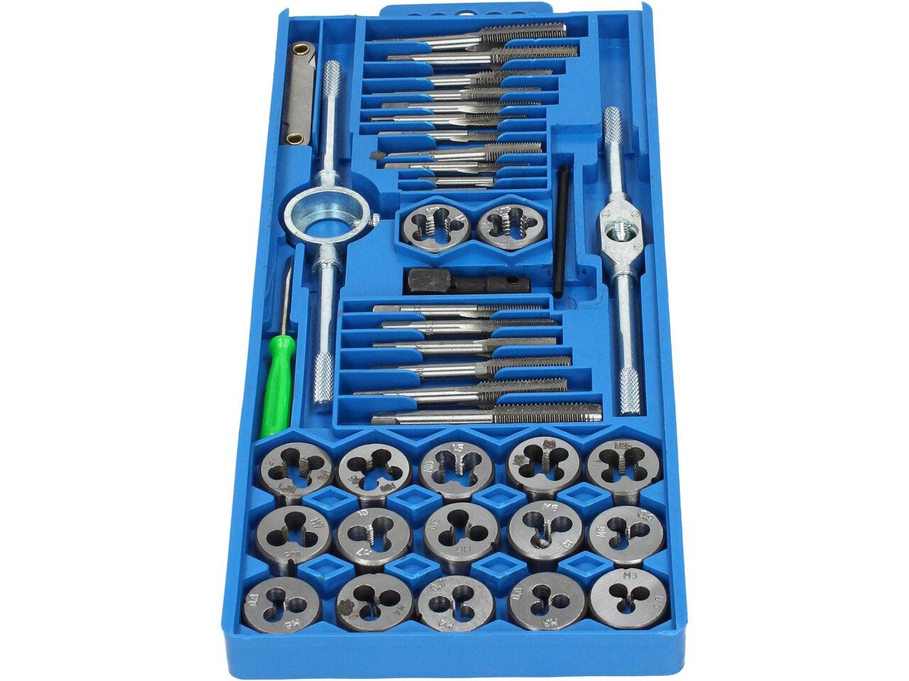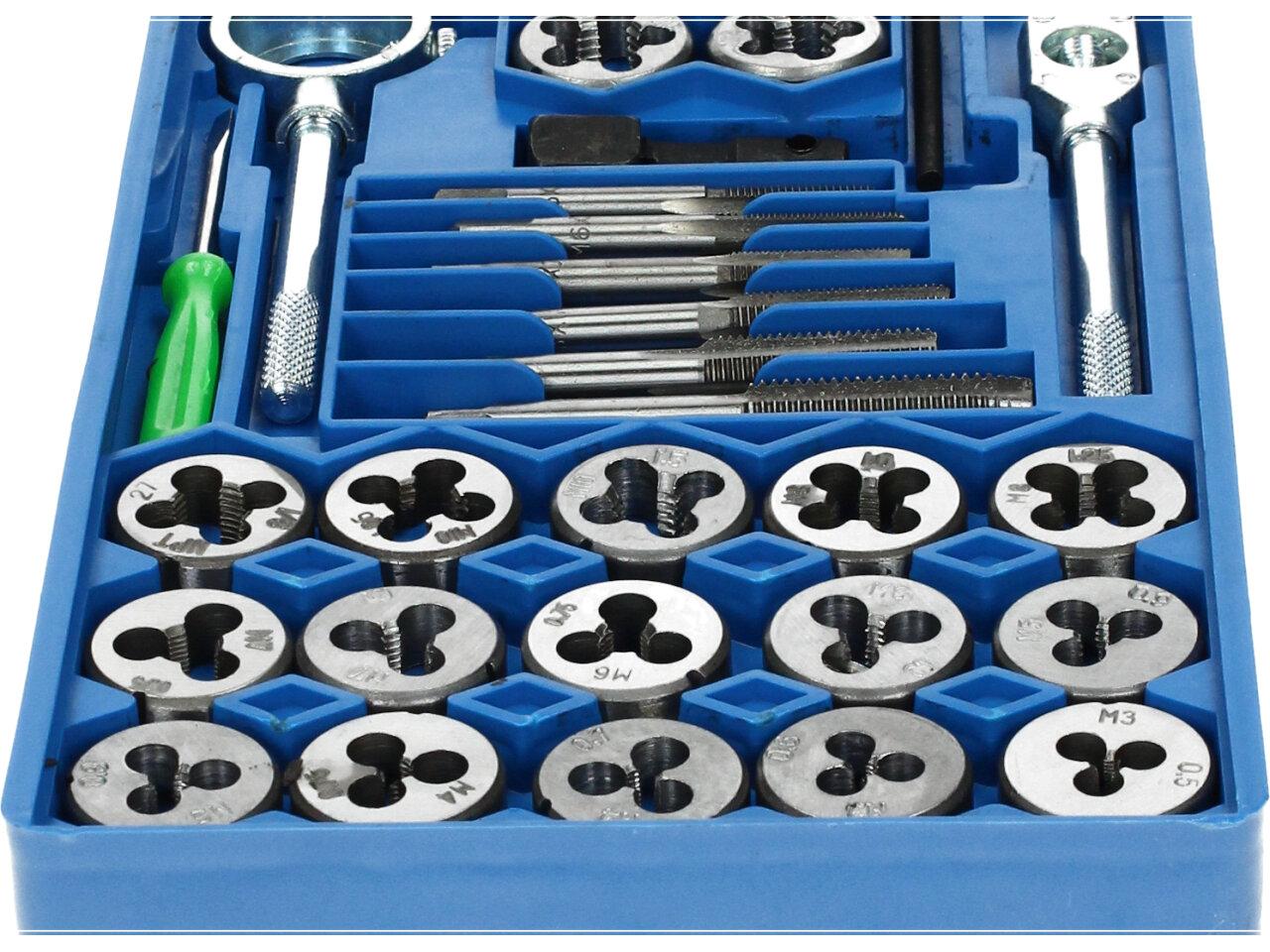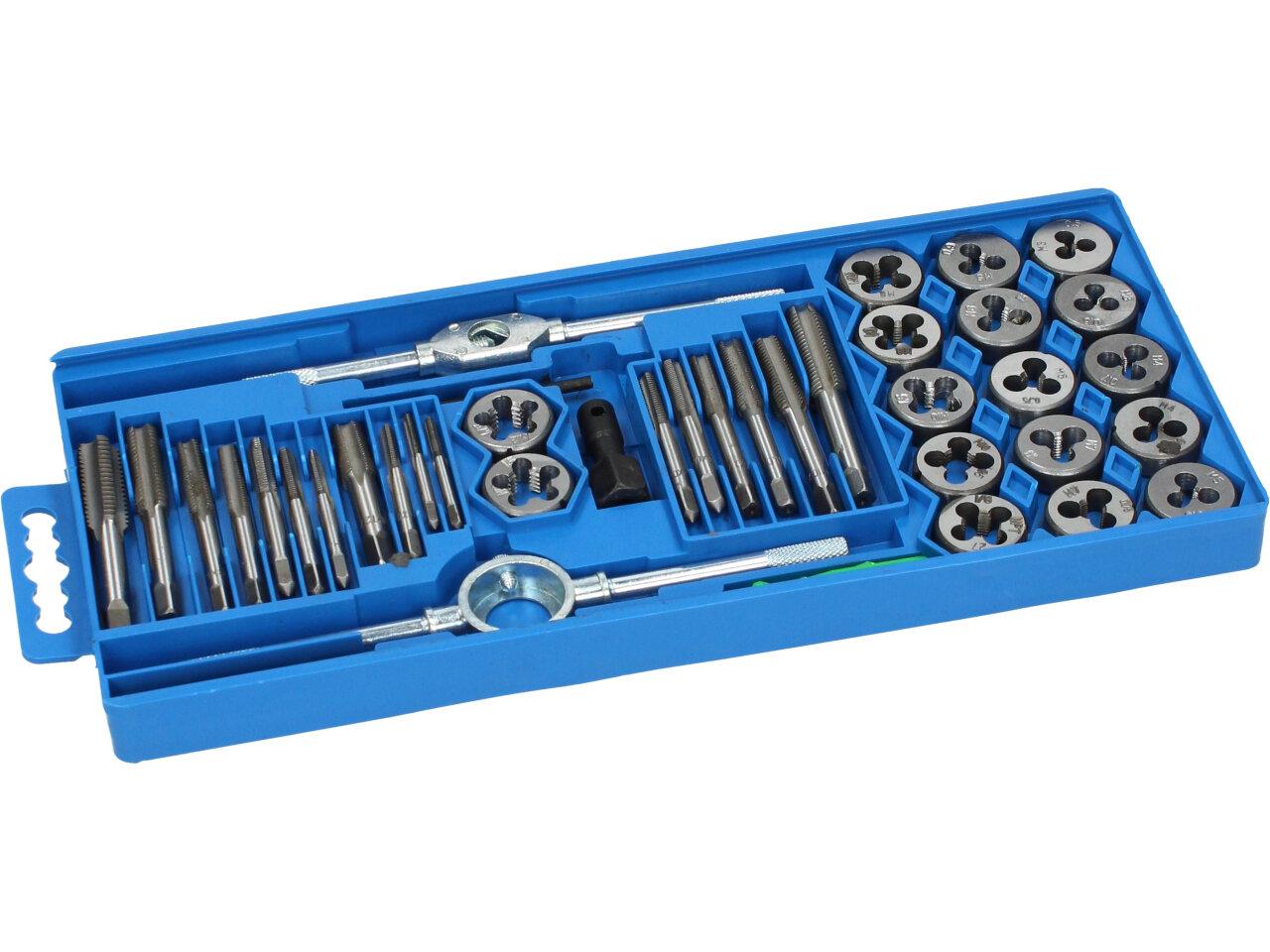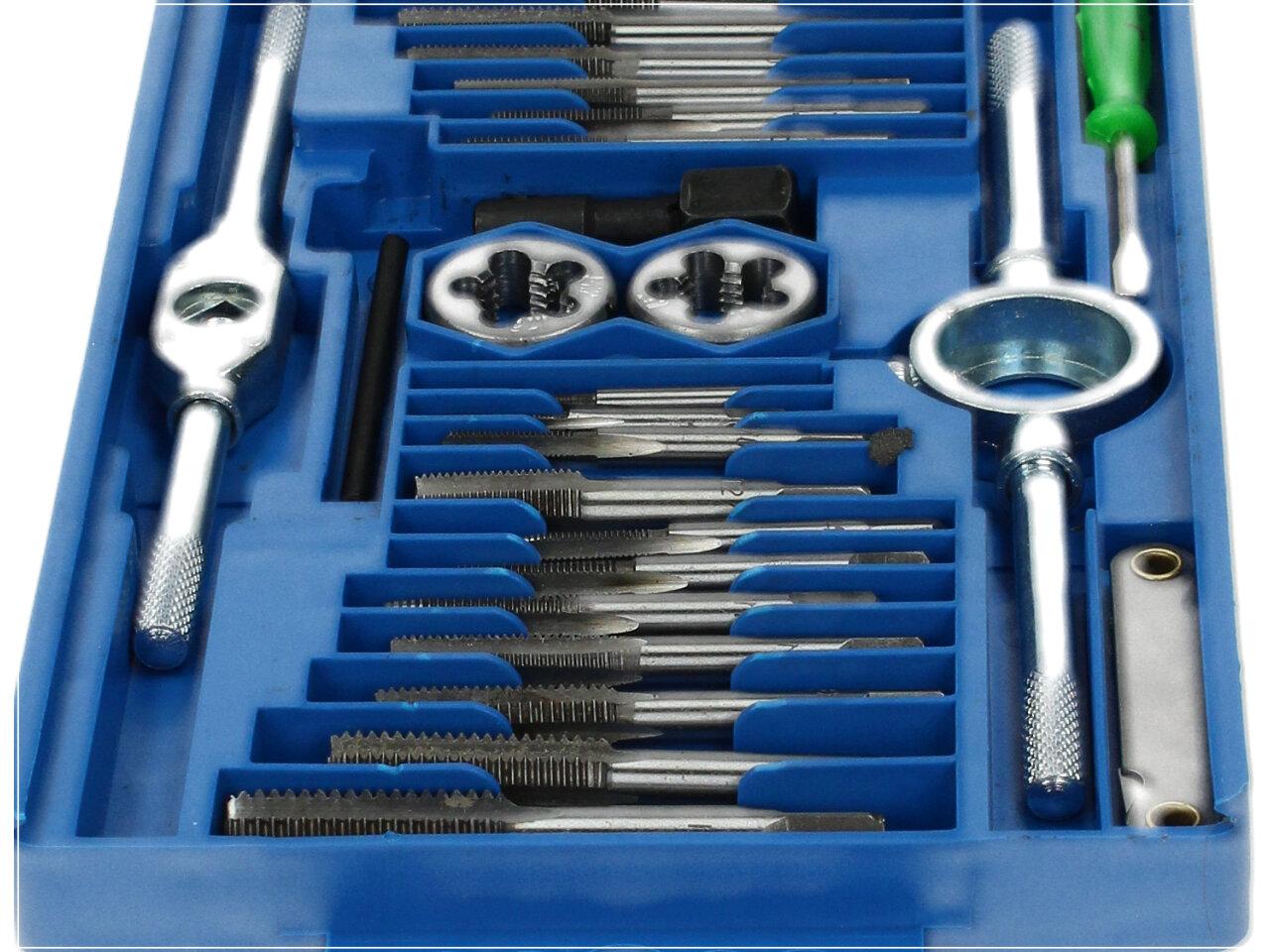 Velká sada závitníků M3 až M7, celkem 40 ks, v plastovém pouzdře – BGS 1900 Profesionální sada 40 ks metrických závitníků a oček od prověřeného německého výrobce. Závitníky i očka jsou vyrobeny ze slitiny wolframu (GCR15), která nástrojům dodává mimořádně vysokou odolnost. Dodáváno v plastovém pouzdře. Závitníky a očka metrické, velikosti M3-M7.