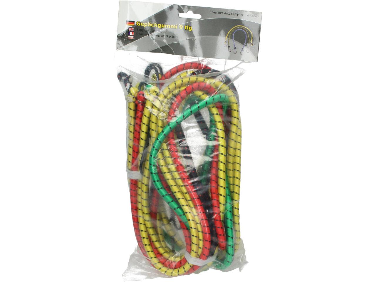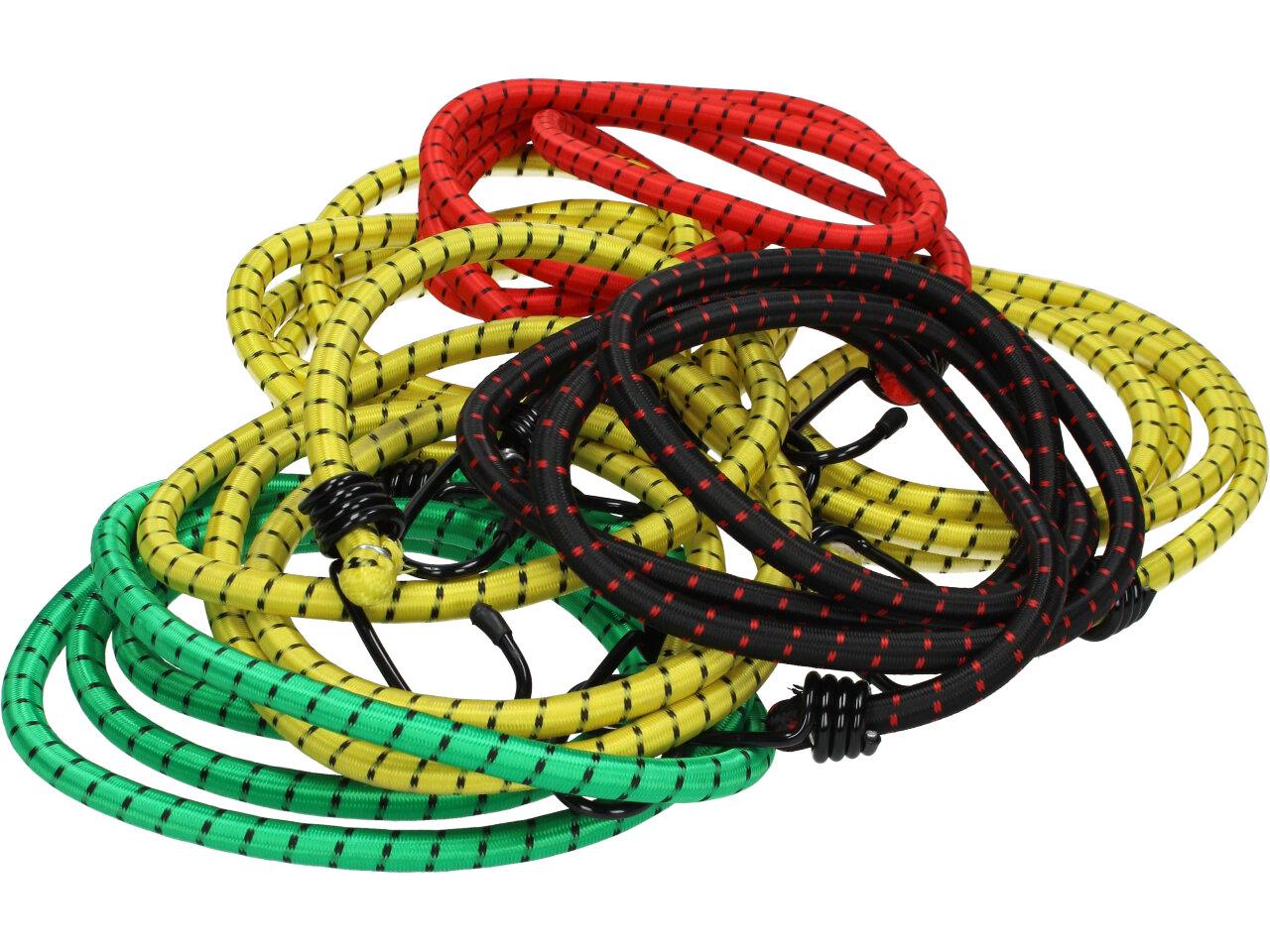 Sada obsahuje 6 kusů natahovacích gum pro uchycení nákladu nebo zavazadel o délce 180 cm, které jsou na obou koncích zakončeny pevnými háčky