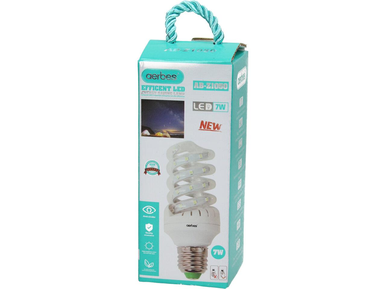 Úsporná žárovka Aerbes 7W Spiral Led E27 je kvalitní náhrada za 60W klasickou žárovku. Žárovka je ve skleněné trubici, umožňující dobré chlazení LED diod, které mají dlouhou životnost. Žárovka je určena na napětí 220V a vyzařuje teplotu světla 6500 K. Úsporná žárovka Aerbes 7W Spiral Led E27 je LED žárovka klasického tvaru s tím rozdílem, že jsou LED CHIPY ve skleněné trubici ve tvaru baňky s nejpoužívanějším závitem E27, které svítí bílým světlem (tzv. bílá studená).