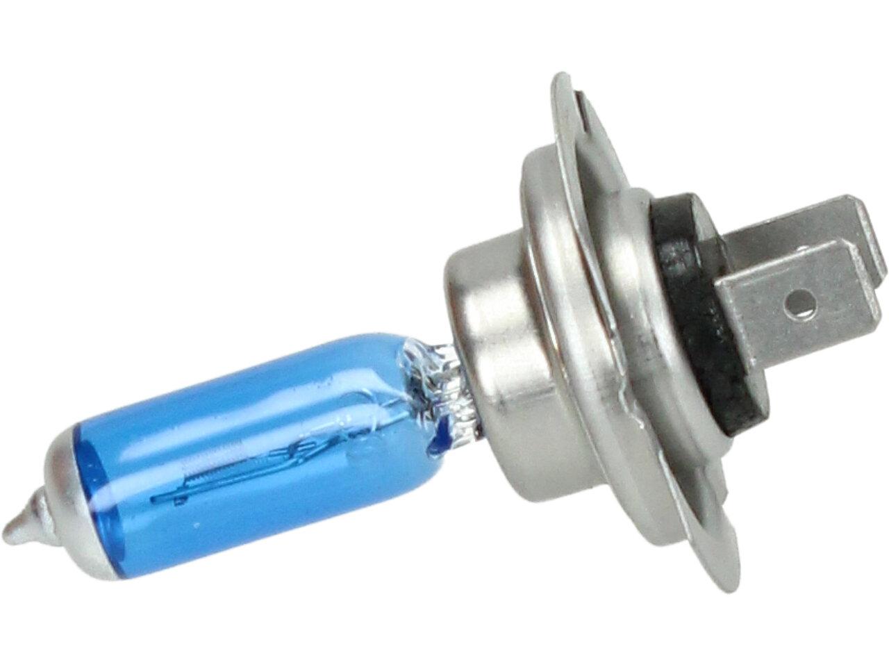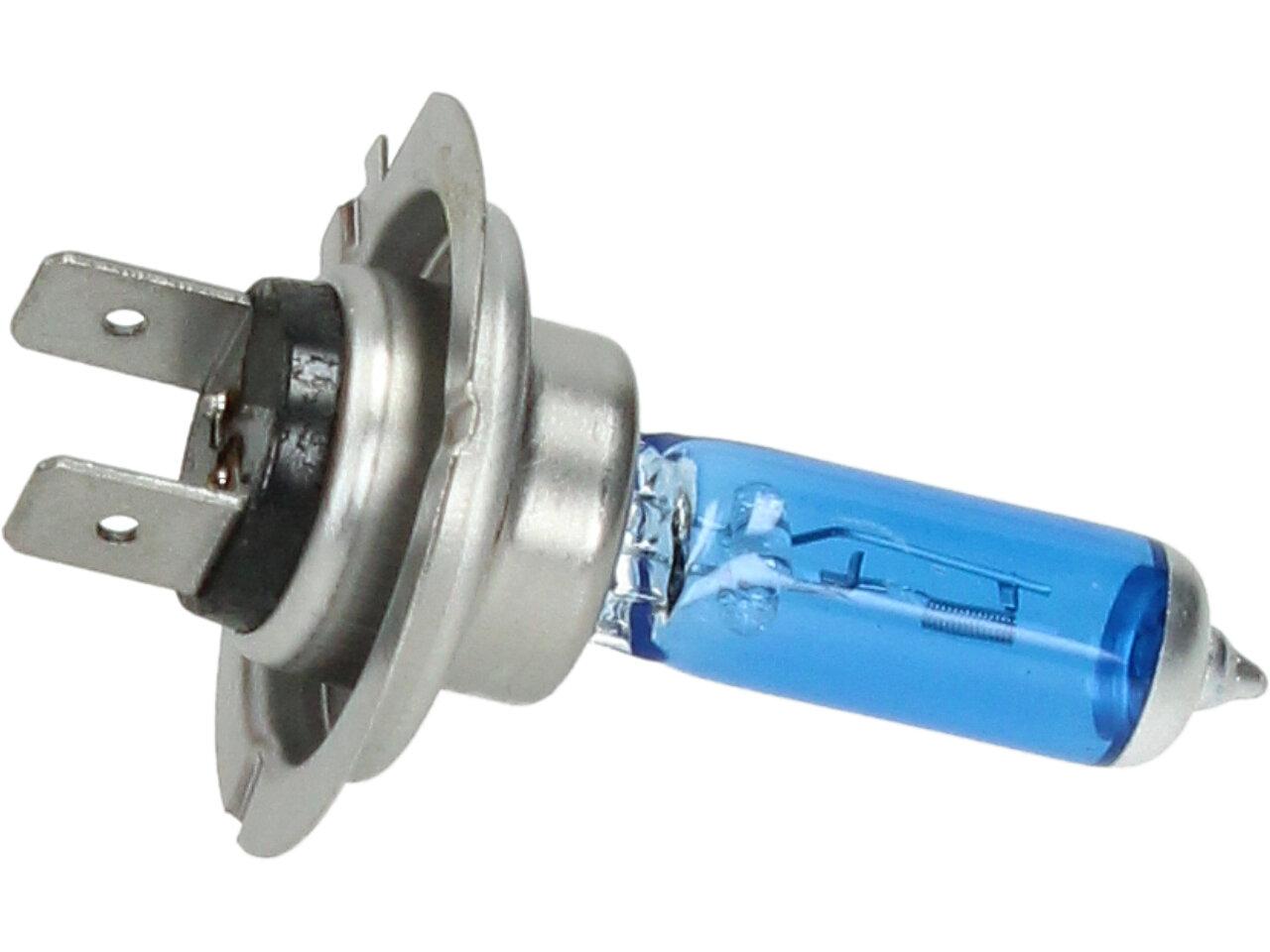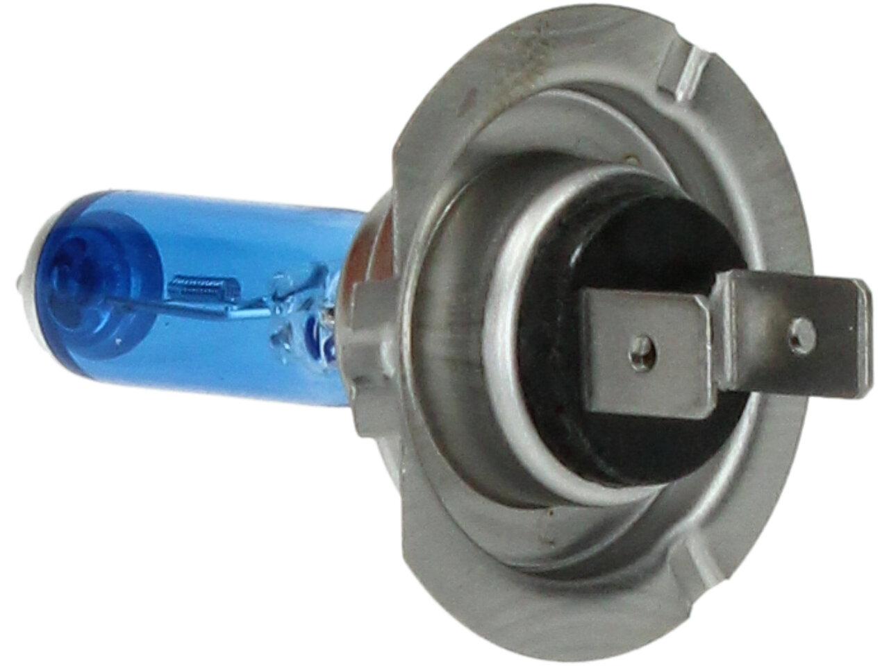Velice odolná H7 žárovka s barvou světla 5500K (studená bílá) sada 2 kusy do světlometu do auta na 12V jako náhrada za klasickou nevýkonou žárovku H7.