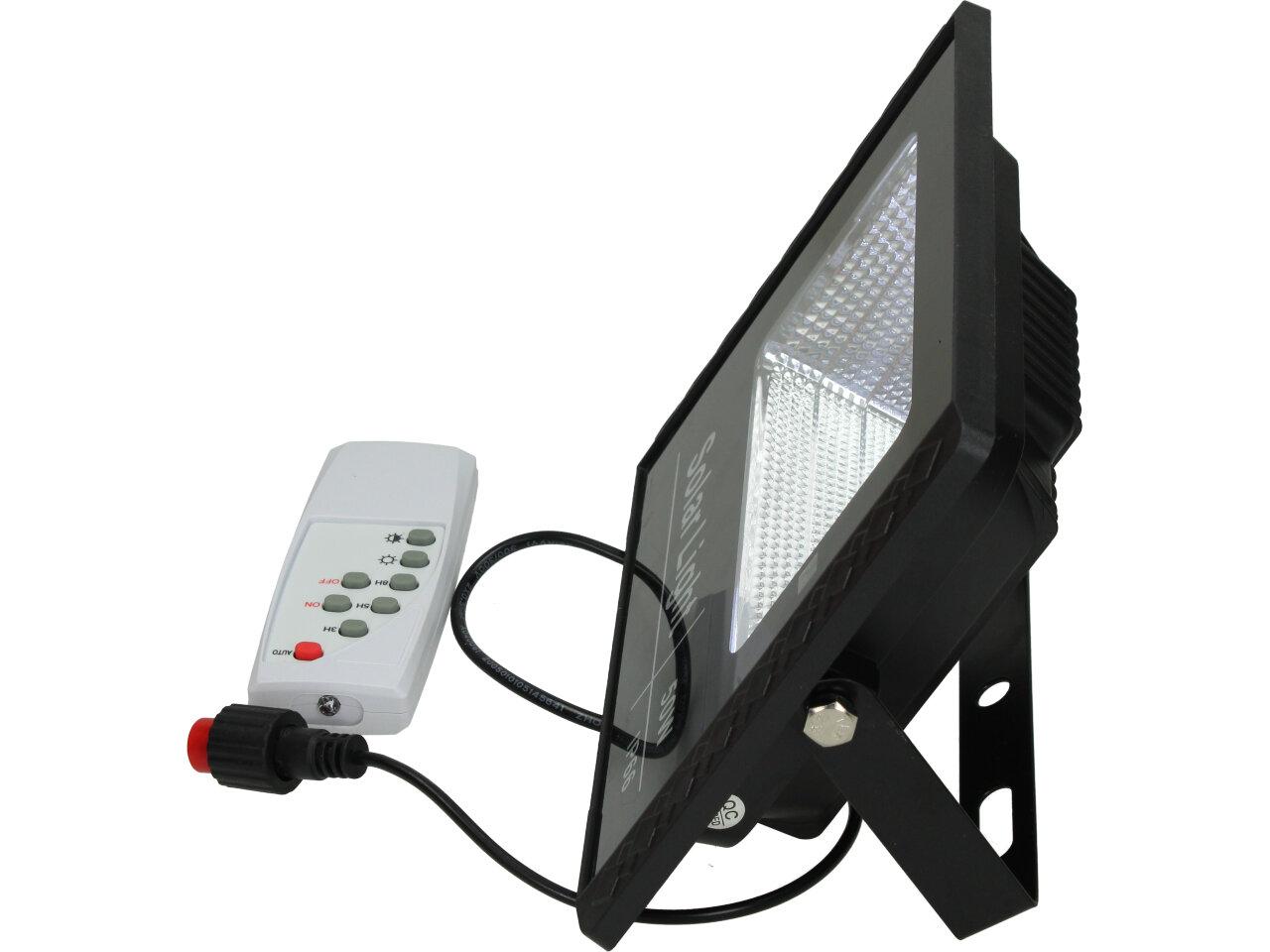 Solární osvětlovací LED technika Reflektor 50W se solárním panelem a dálkovým ovladačem. Díky oddělenému solárnímu panelu můžete používat třeba v karavanu, pod stanem, nebo vjezdové bráně. Solární reflektor o výkonu 50W svítí na vzdálenost cca 6 metrů. U solárního systému lze pomocí dálkového ovladače nastavit automatické zapnutí při setmění, stálé svícení a svícení na daný časový úsek. Pracovní doba na plné nabití cca 6-8 hodin. Spojovací materiál, držáčky a šroubky jsou součástí balení.