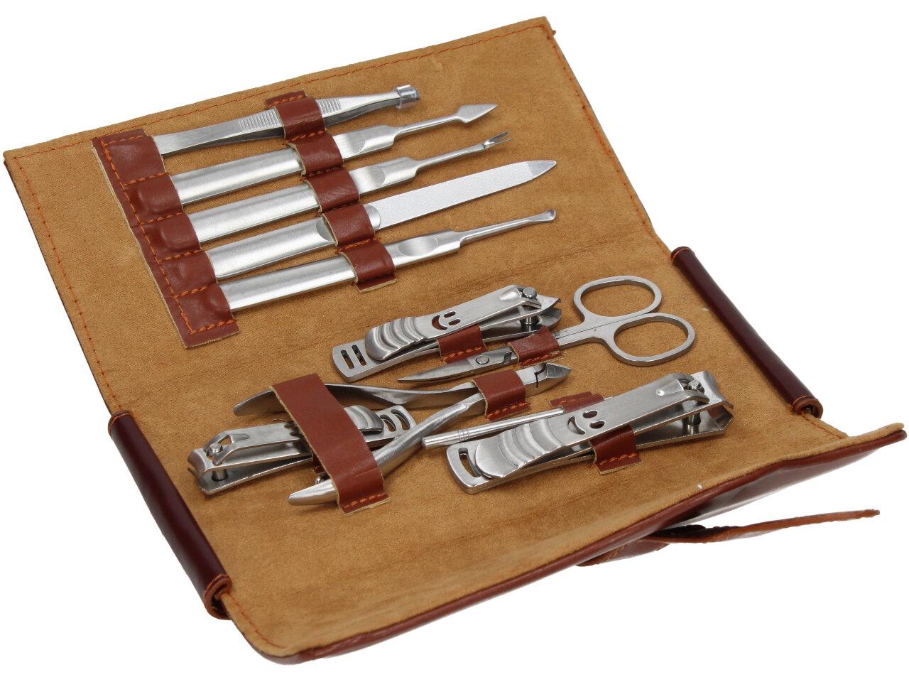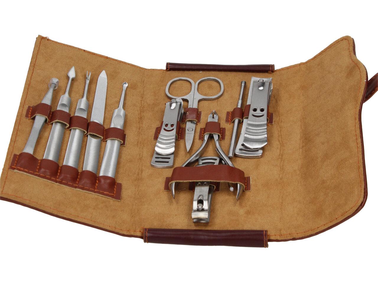 Krásná 11 dílna sada na manikúru nebo pedikúru v koženém pouzdře. Sada obsahuje štípačky, pilník, pinzetu, manikúrní tyčinku, nůžky na kůži, zatlačovač kůžičky, seřezávač kůžičky. Sada je malinká a praktická vhodná do kabelky.