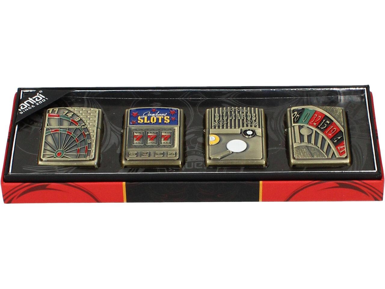 Zapalovače 4 ks - Hazardní hry jsou kvalitní a zajímavé zapalovače navrženy z ušlechtilé oceli s krásnou rytinou motivů hazardních her. Ideální jako dárek pro milovníky hazardu. S těmito zapalovači uděláte zaručeně dojem na své okolí i rodinu. Benzinový zapalovač obsahuje kamínek a knot. Zapalovače z této sady můžete měnit dle vaší nálady nebo zapalovače darovat přátelům.