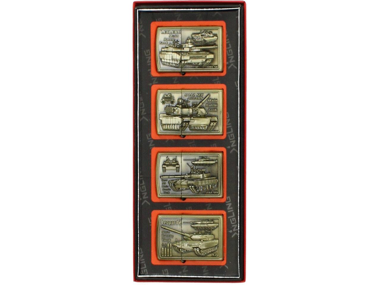 Zapalovače 4 ks - Tanky jsou kvalitní a zajímavé zapalovače navrženy z ušlechtilé oceli s krásnou rytinou motivů tanků Ideální jako dárek pro milovníky hazardu. S těmito zapalovači uděláte zaručeně dojem na své okolí i rodinu. Benzinový zapalovač obsahuje kamínek a knot. Zapalovače z této sady můžete měnit dle vaší nálady nebo zapalovače darovat přátelům.