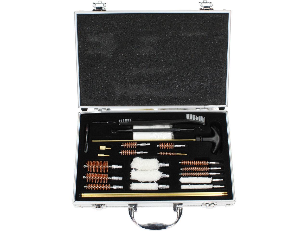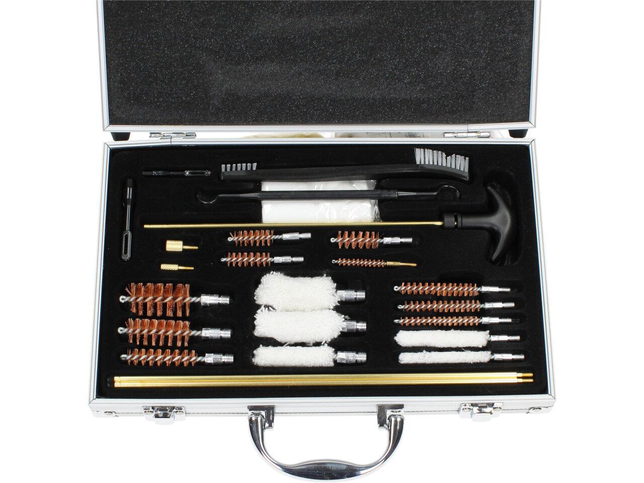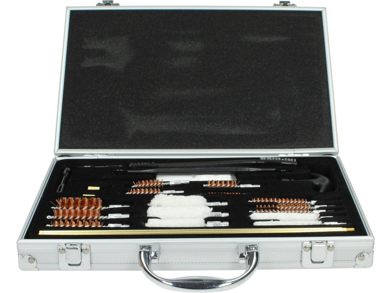 Univerzální čistící sada na zbraně v stříbrném kufru s 24 kusy nástrojů a příslušenstvím je perfektní volbou pro každého majitele zbraně, který se chce postarat o svou zbraň a zajistit její bezproblémový chod. Tato sada obsahuje vše, co potřebujete k čištění a údržbě vaší zbraně, a to vše v elegantním stříbrném kufříku.